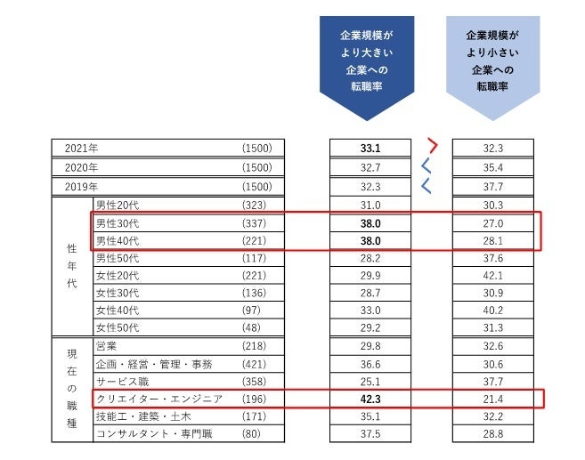- 「企業規模の大きい企業」への転職、および転職によって「年収が上がった」人の比率が増加。特に30・40代男性のクリエイター・エンジニア職で高い傾向。IT関連の高スキル者に対する採用ニーズの高まる結果に。【図4、5】