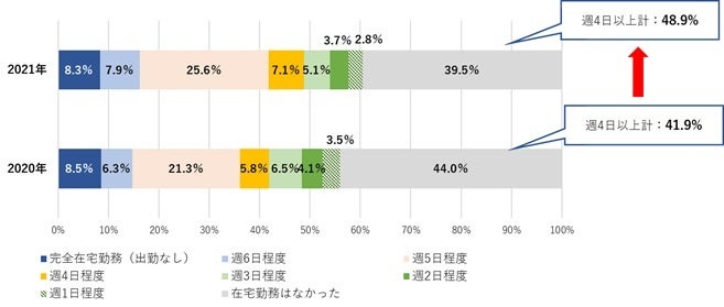 転職者のうち在職中に転職した割合は73.1%と、2020年より5.6pt増加している。同じく転職者のうち週4日以上在宅勤務をしている割合は48.9%と、2020年の調査時点より7.0pt増加した。在宅勤務の浸透により職場に出勤する時間が削減されることで転職活動にあてられる時間が増え、在籍中に転職活動がしやすい環境となったことも、転職率増加の一因と考えられる。【図2、3】
