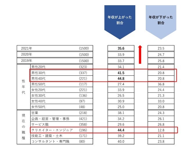 ◆2020年まで、企業規模がより大きい企業とより小さい企業では、より小さい企業への転職の方がやや多かったが、2021年はより大きい企業への転職率が高くなった(企業規模がより大きい企業への転職率:33.1%、より小さい企業への転職率:32.3%)。性年代別では男性30代40代、職種別ではクリエイター・エンジニア職において、企業規模がより大きい企業への転職率が高くなっている。前職より年収が上がった割合は、全体で35.6%と、この3年間で最も高くなった。転職後の企業規模の変化と同様に、性年代別では男性30代40代が、職種別ではクリエイター・エンジニア職において、年収が上がった割合が高くなった。【図4、5】