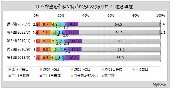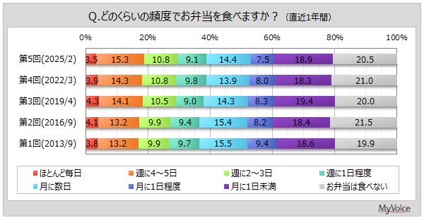 マイボイスコム株式会社(東京都千代田区、代表取締役社長:高井和久)は、5回目となる『お弁当』に関するインターネット調査を2025年2月1日~7日に実施しました。