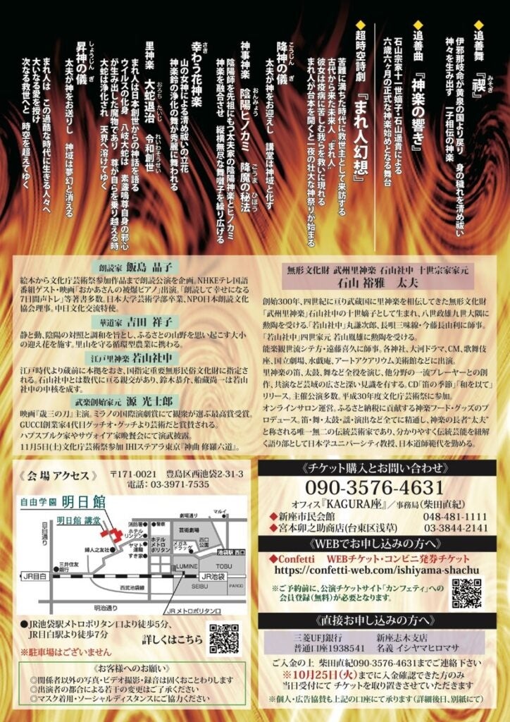 神楽の長者“太夫“の称号に相応しい十世宗家家元 石山裕雅の芸域の広さ、卓越した技芸、作劇・演出の妙技にも注目が集まります。