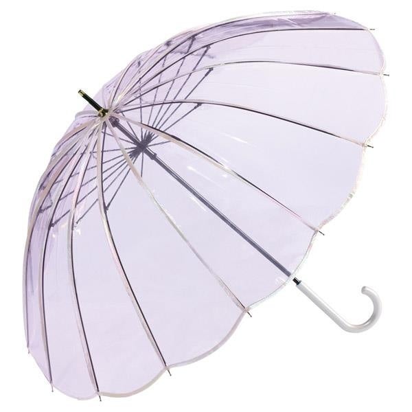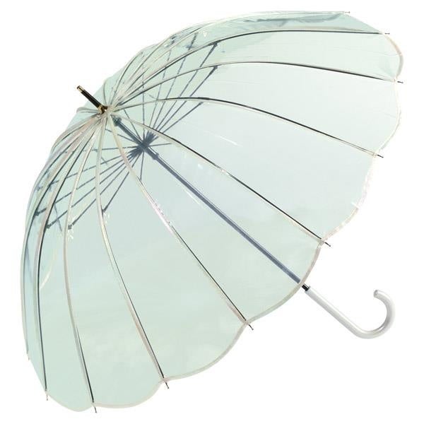 きらきらとした質感のパイピングやパールボタンの留め具が目を引く、貝殻のようなフォルムが特徴の風に強い16本骨の長傘。