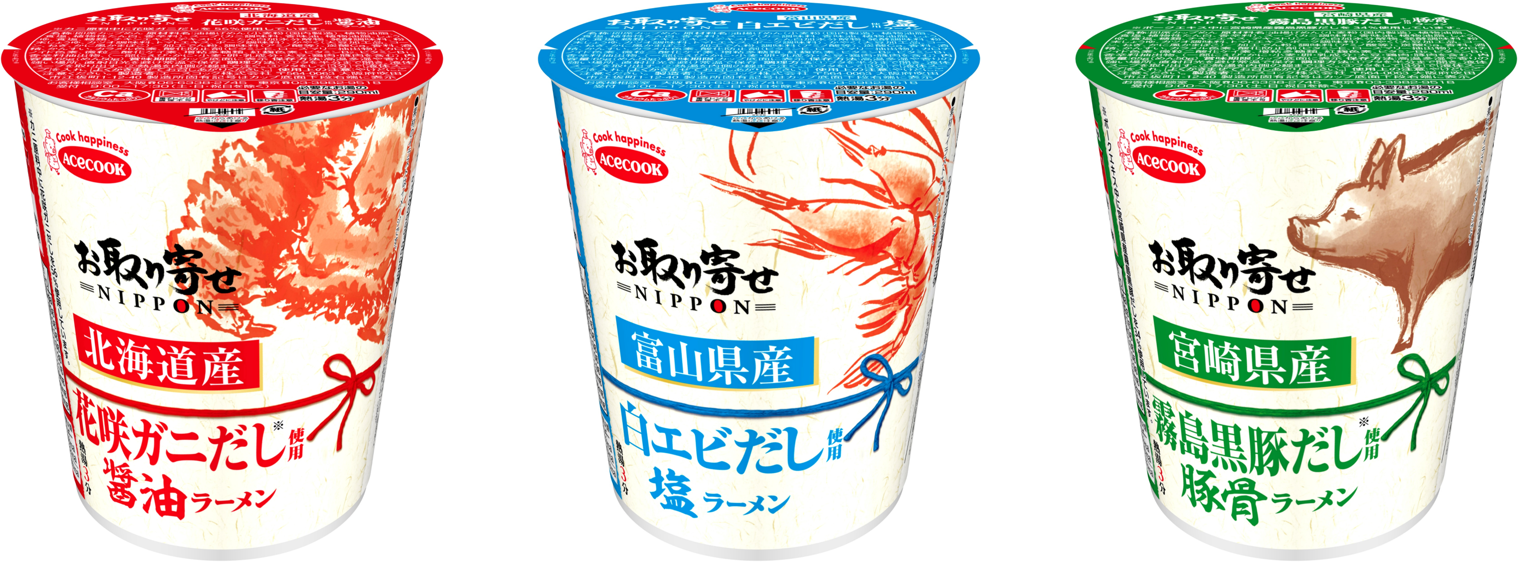 エースコック株式会社(本社:大阪府吹田市 社長:村岡寛)は、2022年7月25日より、「お取り寄せNIPPON 北海道産花咲ガニだし使用 醤油ラーメン/富山県産白エビだし使用 塩ラーメン/宮崎県産霧島黒豚だし使用 豚骨ラーメン」を新発売します。