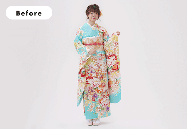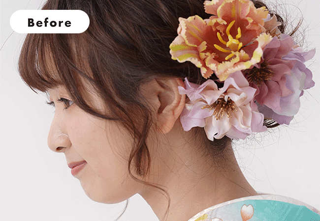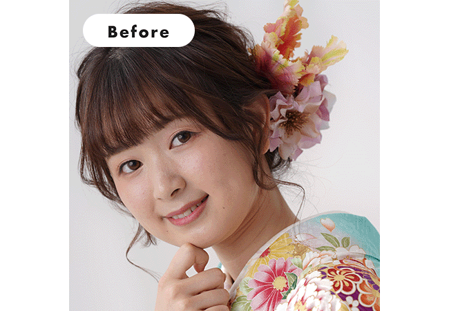 成人式だから盛り過ぎたくないけど、全く盛れていないのは嫌!かわいくなりたい!という要望を叶える自然な仕上がりを実現。プリントシール機ともカメラアプリとも違う、成人式フォトとしての盛りを追求しました。成人式で女の子の多くがこだわりをもつ髪色や振袖の色柄はそのままにしつつ、顔と全身バランスだけを整えることで、魅力を最大限引きだします。