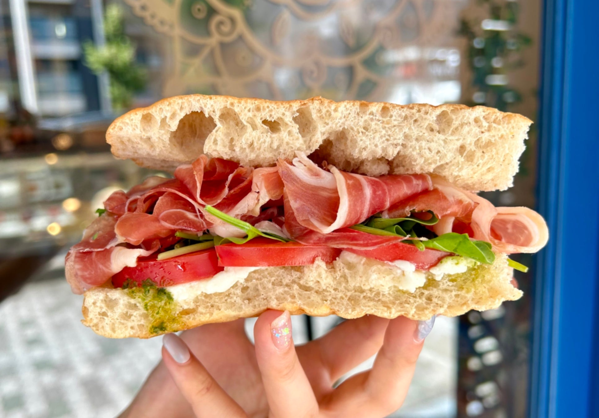 無添加のオリジナルフォカッチャに、ボローニャハムとパルミジャーノ、香り高い自家製ピスタチオソースをたっぷりとトッピングした本場のパニーニ。