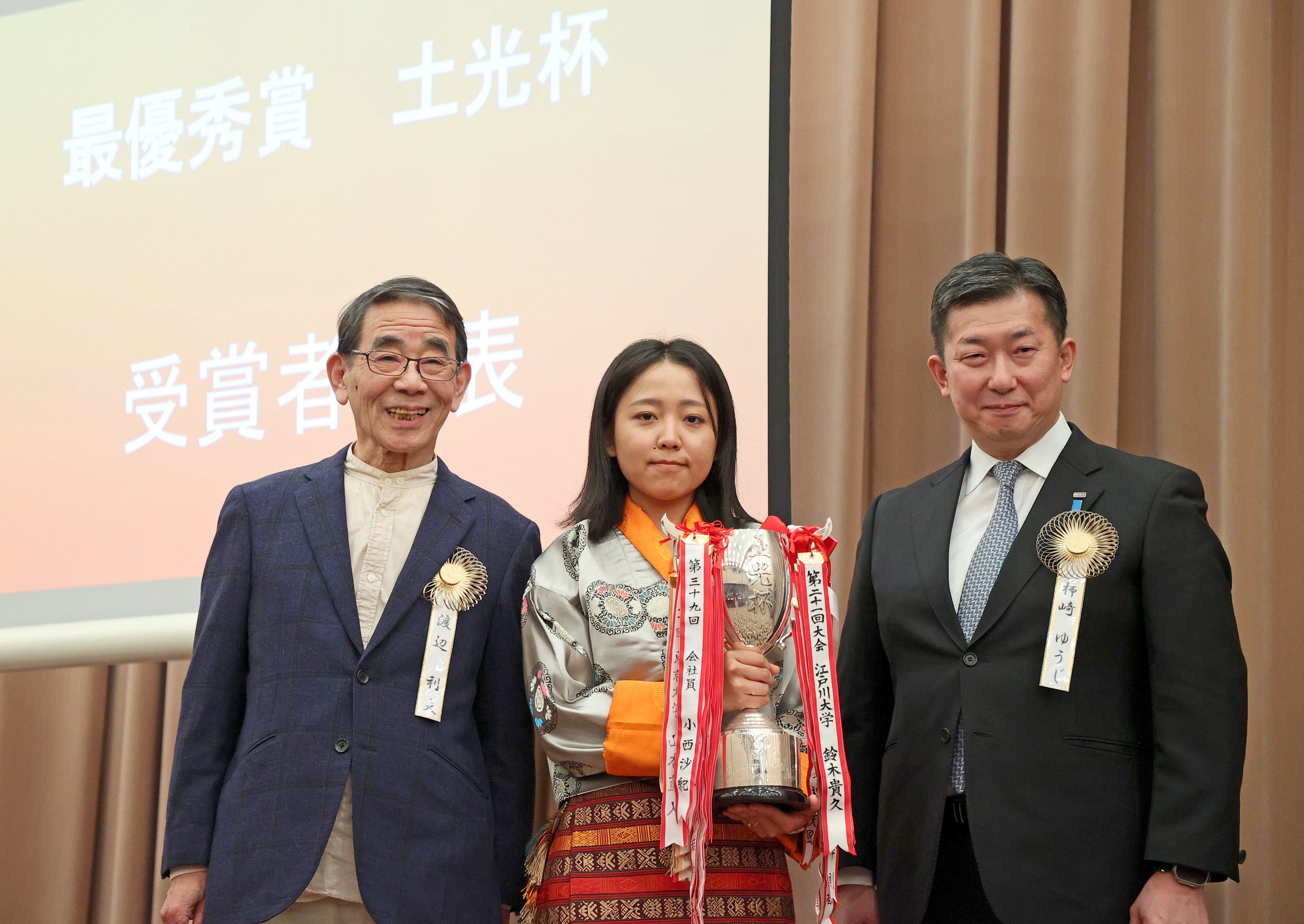 最優秀賞の土光杯はブータン人留学生で神奈川県立産業技術短期大学校1年のケザン・ワンモさん(26)=写真中央=が受賞。ワンモさんは「言語は国の文化と歴史を守る。日本語の大切さを自覚すべきだ。日本語を勉強し、母国への愛が深まった」などと述べました。