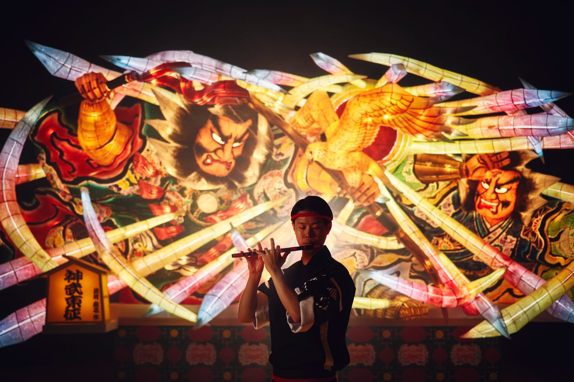 露天風呂を囲む池に浮かぶねぶたの題材は、水と雷を司り、穢れを洗い流す雷神です。本企画開始以来、疫病や邪気から人々を守る「鍾馗(しょうき)」、知恵や開運をもたらす「毘沙門天(びしゃもんてん)」が登場してきました。2022年からは、災いや邪気を払い、さらなる発展を願う思いで制作された「雷神」が登場し、入浴する人々を見守ります。