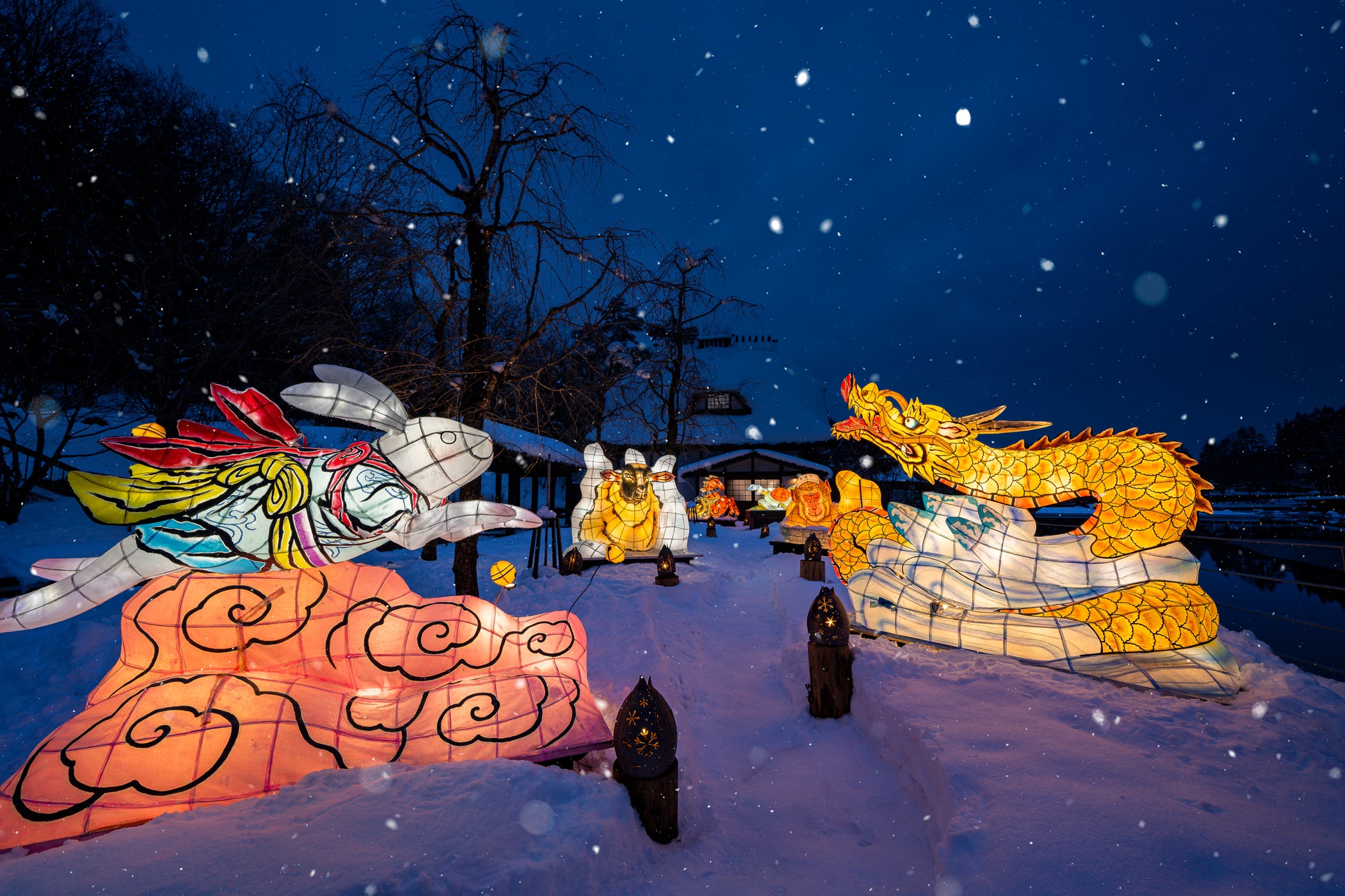 青森屋敷地内の公園にて、青森の夏の風物詩であるねぶたを、雪景色の中で鑑賞できるプログラムです。干支と青森にちなむ要素を掛け合わせた、個性あふれる6体の干支ねぶたが登場します。力強い造形や鮮やかな色合いを間近で鑑賞でき、白い雪とのコントラストが美しい幻想的な景色を楽しめます。