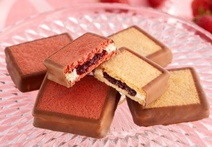 北海道産苺の甘酸っぱい苺入りのジャムを薄焼きクッキーとバタークリームでサンド。仕上げにまろやかなチョコレートで囲み、酸味と甘みのバランスが抜群。