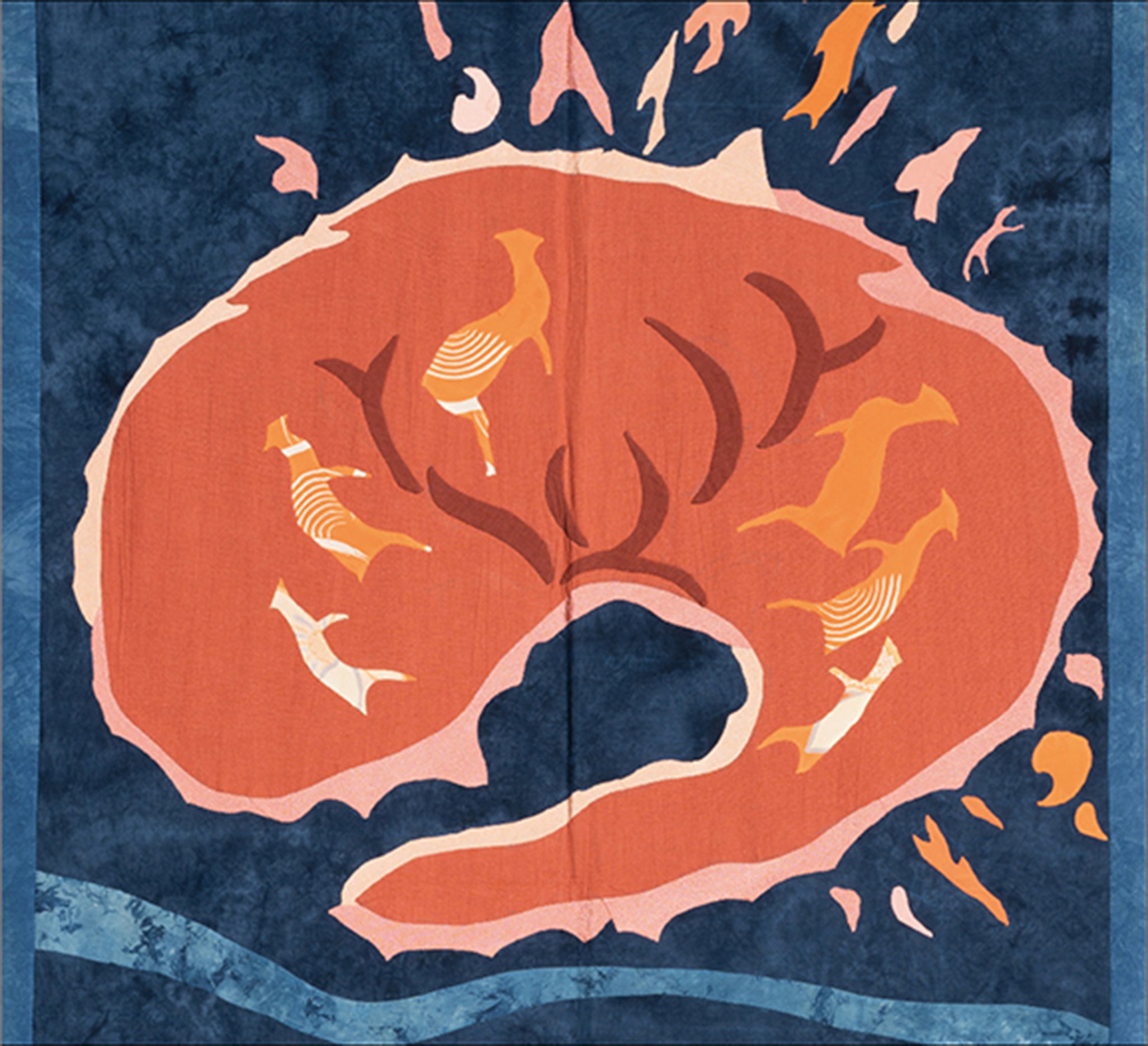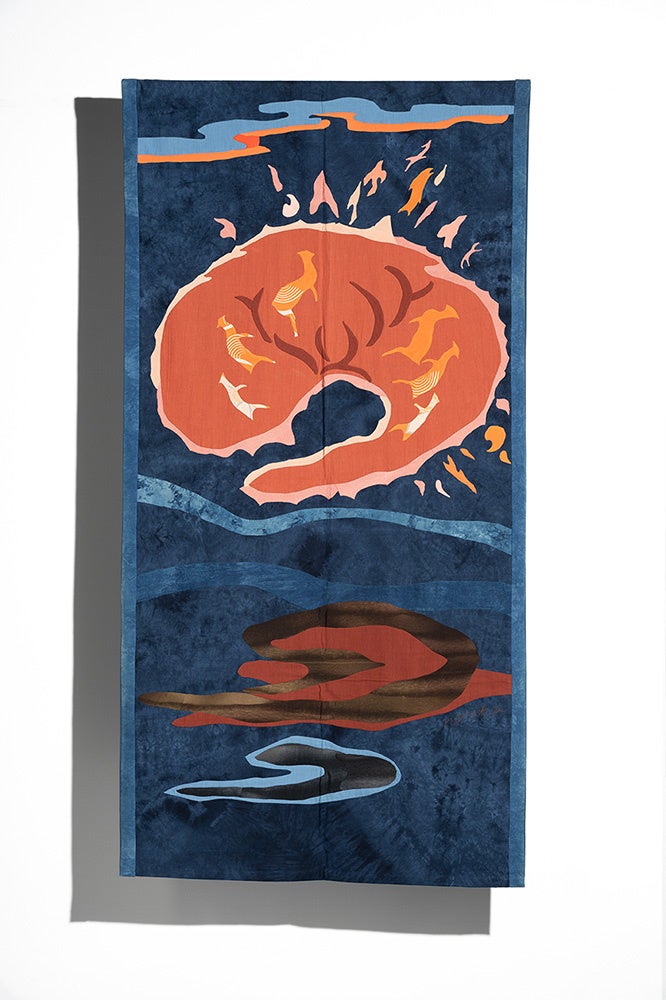 北海道旭川市出身の川村 則子(かわむら のりこ)氏は、1988年に札幌で開催された「世界・食の祭典」において初めてタペストリーを製作されました。アメリカのスミソニアン国立自然史博物館でのアイヌ民族をテーマとした特別展への出品や、国内各地で個展等を開催し、自身、そしてアイヌの世界を抽象的なタペストリーを通して表現している布アーティストです。