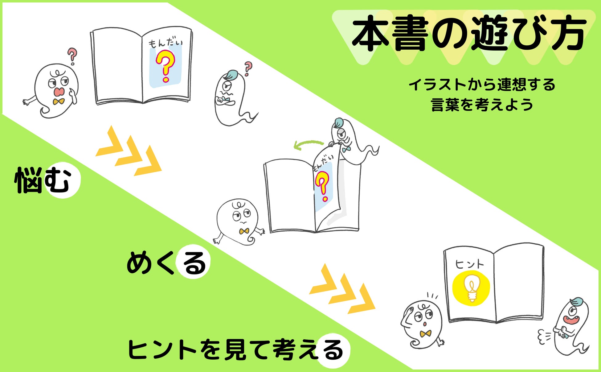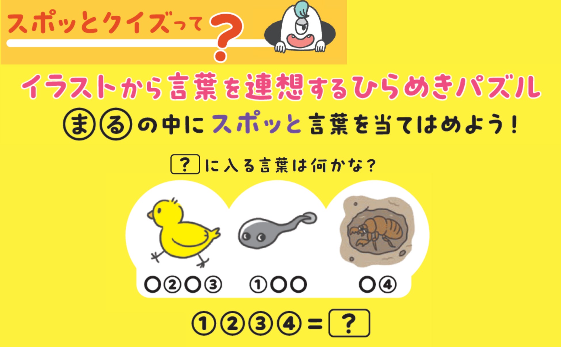 スポッとクイズはイラストと文字数をヒントに言葉を連想して考える新感覚の連想ワードパズルです。イラストをヒントに〇〇(まる)の中に入る言葉を考えるだけ、という、とっても簡単なルールです。〇〇(まる)の中に、スポッと文字がはまれば、まるでスポットライトの光がさすように、こたえが浮かんでくるかもしれません。イラストの名前そのものを入 れようとしても〇〇(まる)の数と文字数が合わないこともあります。その場合はイラストに共通するものを考えてみましょう。2段階ヒントで、行き詰ったときのひらめきをサポートします。