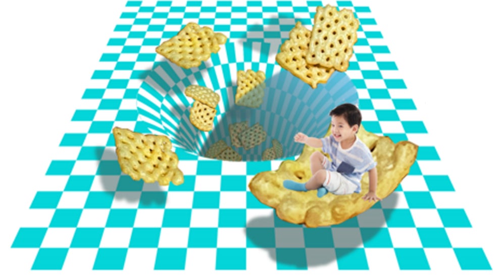 ●トリックアートデザインで、まるで商品がパッケージから飛び出しているかのような不思議なデザインです。商品をつまんでいるような面白い写真が撮れ、親子で楽しんだり友人にシェアしたくなるように工夫しました。