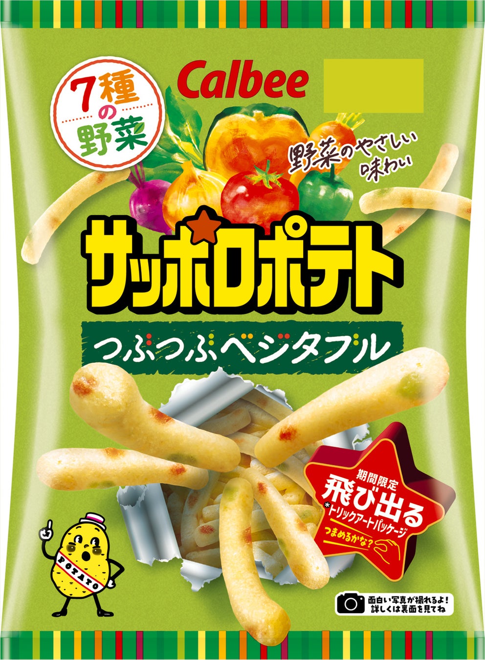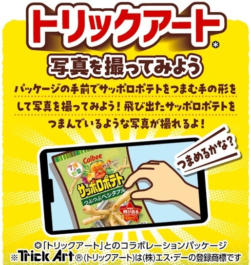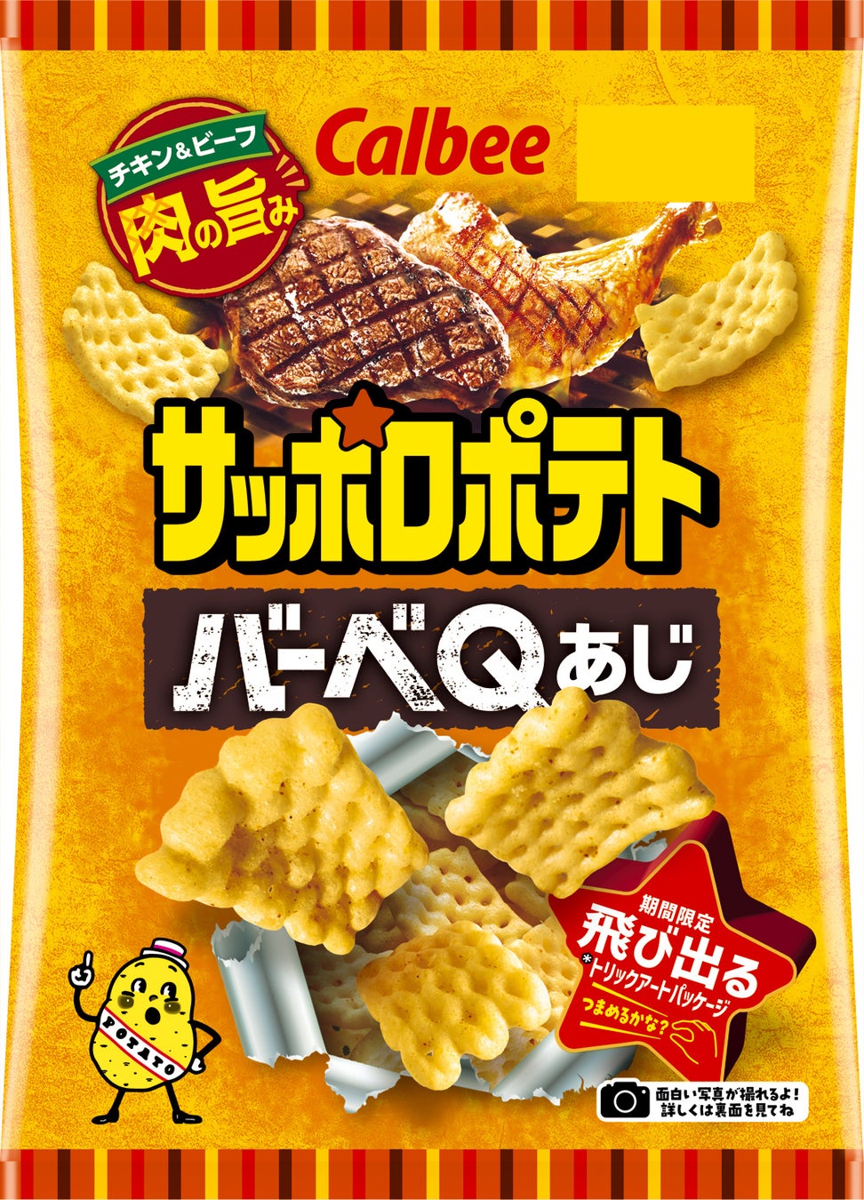 商品が飛び出て見える?!カルビー史上初の TrickArt®(トリックアート)パッケージになった『サッポロポテト つぶつぶベジタブル/バーベQあじ』『サッポロポテトロング やみつきコンソメ味』