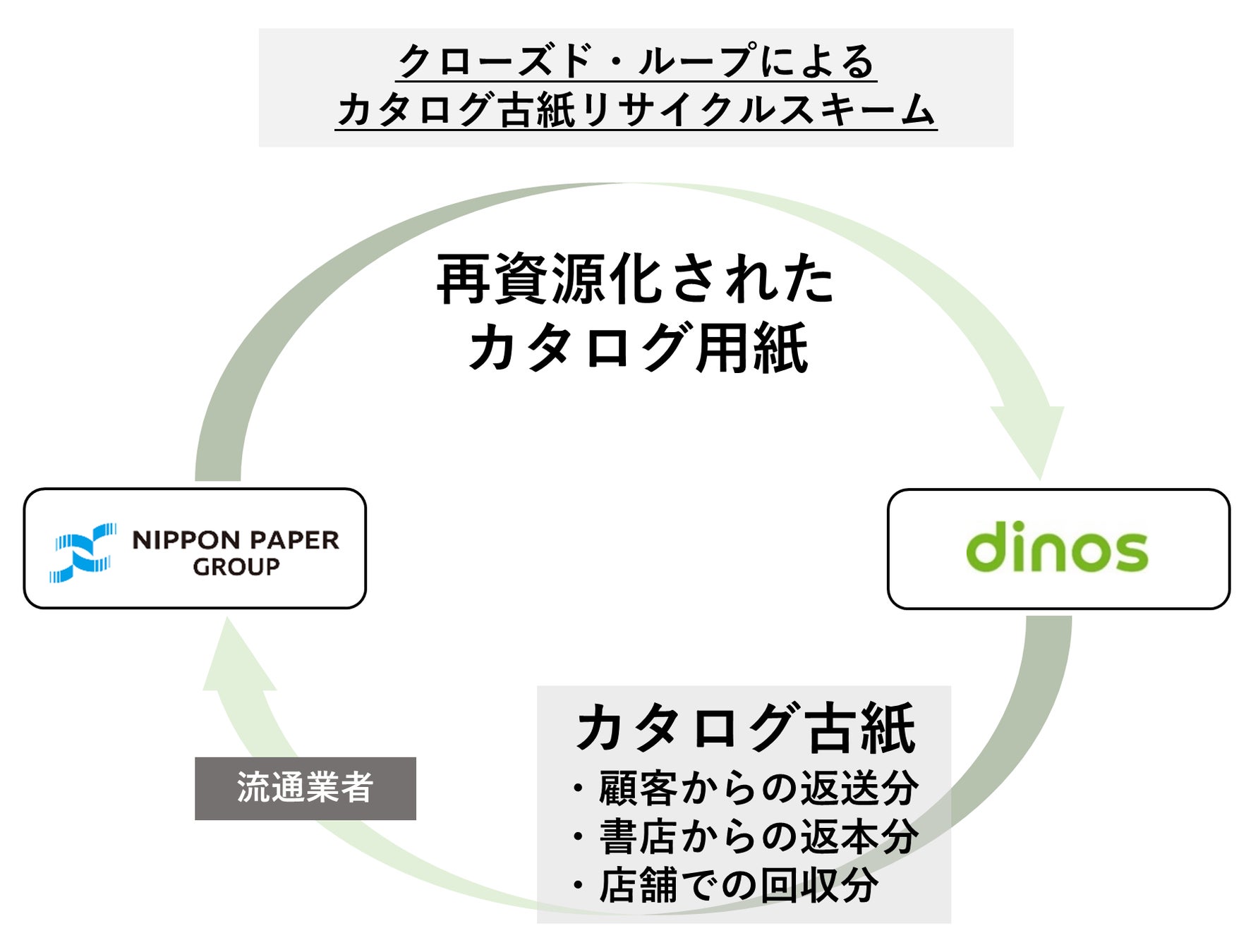 当社では、「ディノス」のお客様への配布用と書店販売用カタログに関して、それぞれ、住所不明等の理由で返送されたり、店頭から返本されたりした場合は、それらをカタログ古紙として、カタログ用紙調達先である日本製紙株式会社が運用する、「クローズド・ループ」形式で国内にて循環させる取り組みに提供しています。