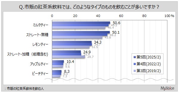 紅茶飲料飲用者がよく飲むタイプは(複数回答)、「ミルクティー」が50.6%、「ストレート・無糖」が50.1%、「レモンティー」が34.3%、「ストレート・加糖」が24.9%です。