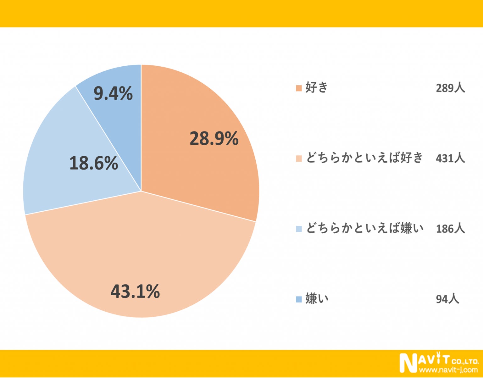 野菜ジュースが好きですか?というアンケートに対して「どちらかといえば好き」と回答された人が43.1%で「好き」と答えた人が28.9%で、72.0%の人が野菜ジュースが好きだという結果になりました。