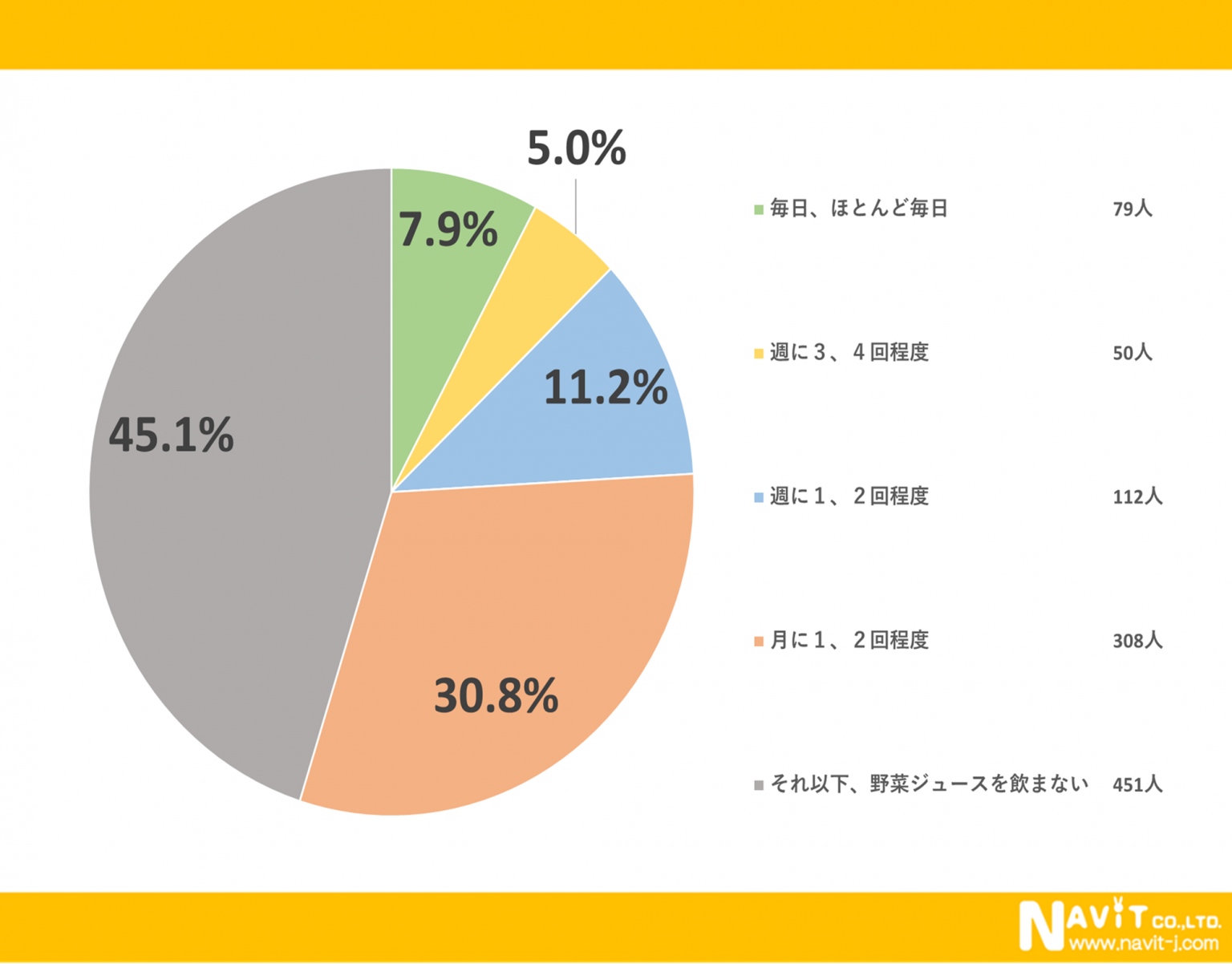 野菜ジュースを飲む頻度についてのアンケートで一番多かったのは、「月に1、2回程度」と回答された人で30.8%という結果になりました。次に「週に1、2回程度」と回答された人が11.2%で「毎日、ほとんど毎日」と回答された人が7.9%でした。