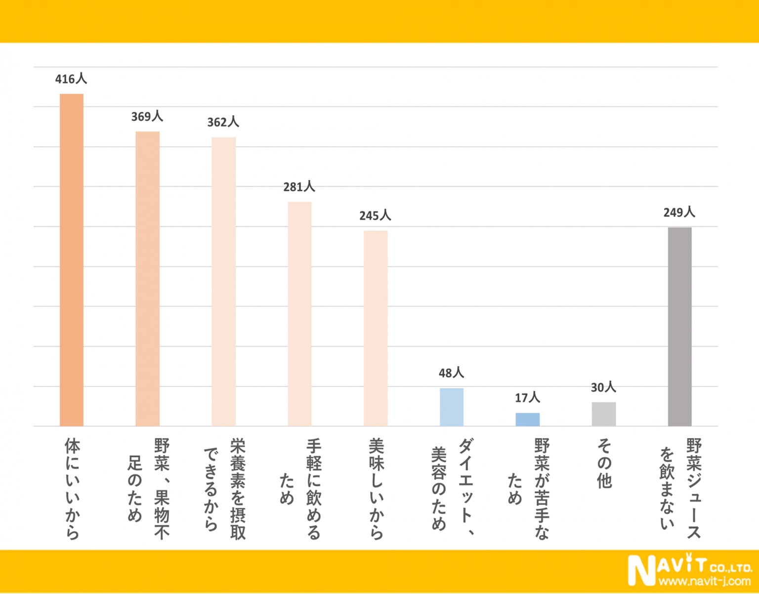 野菜ジュースを飲む理由を複数回答で答えていただきました。一番多かった回答は「体にいいから」が416人、次に多かったのは「野菜、果物不足のため」で369人で3番目に多かったのは「栄養を摂取できるから」という回答が362人という結果になりました。日常の食事で野菜が不足していると考えている人が多いようです。