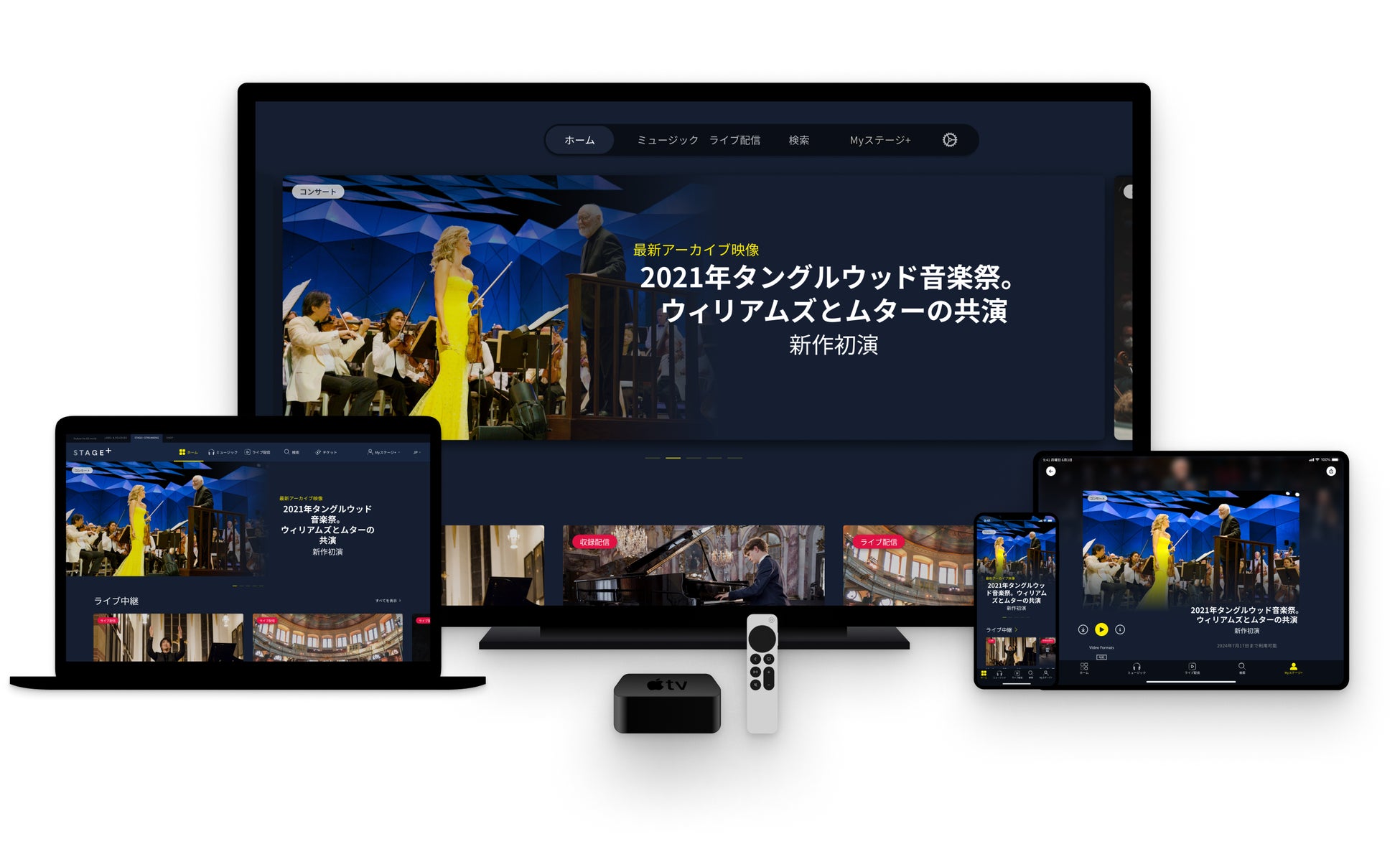 STAGE+は、ウェブサイトのほか、テレビおよびスマホアプリで利用できます。多くの映像が4Kやドルビー・アトモスに対応しており、音声はオリジナル音源とほとんど変わらないロスレス音質で提供されています。