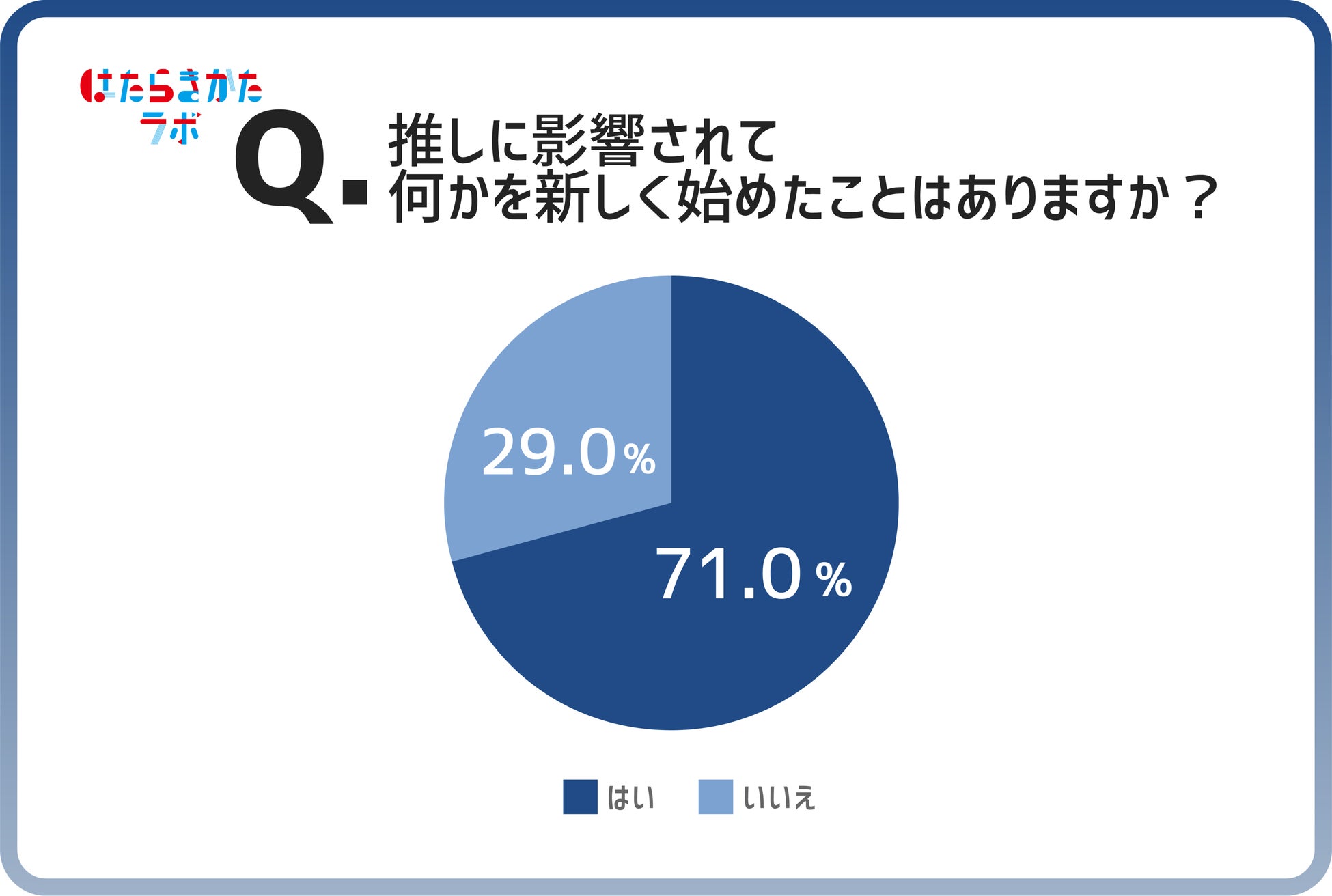 推しに影響されて何かを新しく始めたことはありますか?という質問では、7割以上が「はい」と回答。アンケートで「推しが韓国人で韓国語の勉強を始めました」「影響を受けて動画編集をするようになった」というコメントや、座談会では「推しがミニマリストで、真似して生活してみたら無駄遣いをしなくなった(お笑い芸人推し)」など生活様式が大きく変化するほど影響を受けた人もいました。