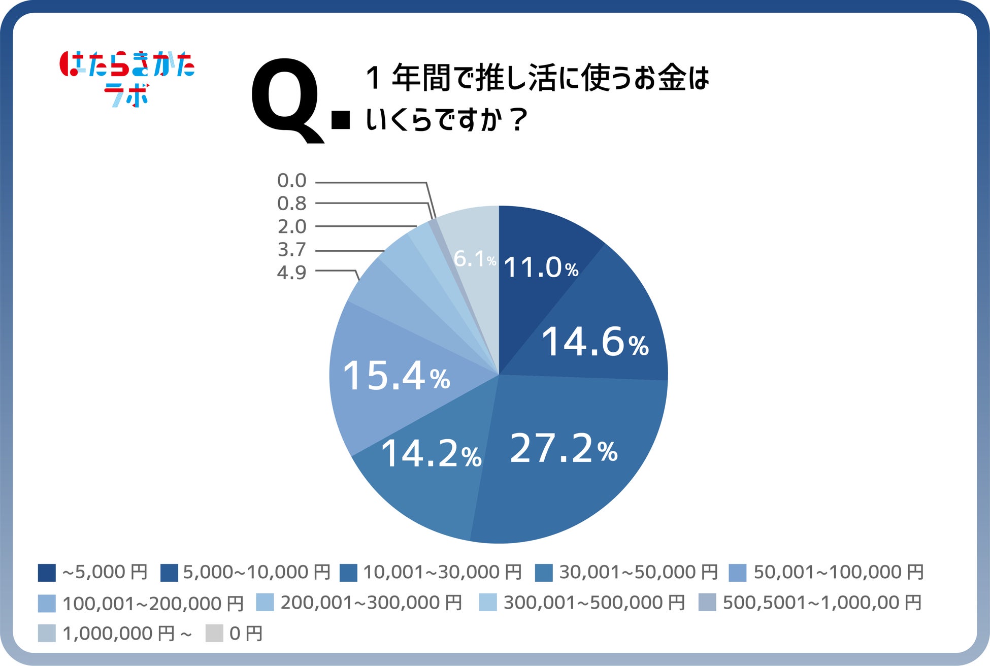 推しがいると答えた人に、1年間でいくら推し活にお金を使うのか尋ねたところ、約半数の47.2%が3万円超と回答しましたが、細かい金額には個人差があるという結果が出ました。