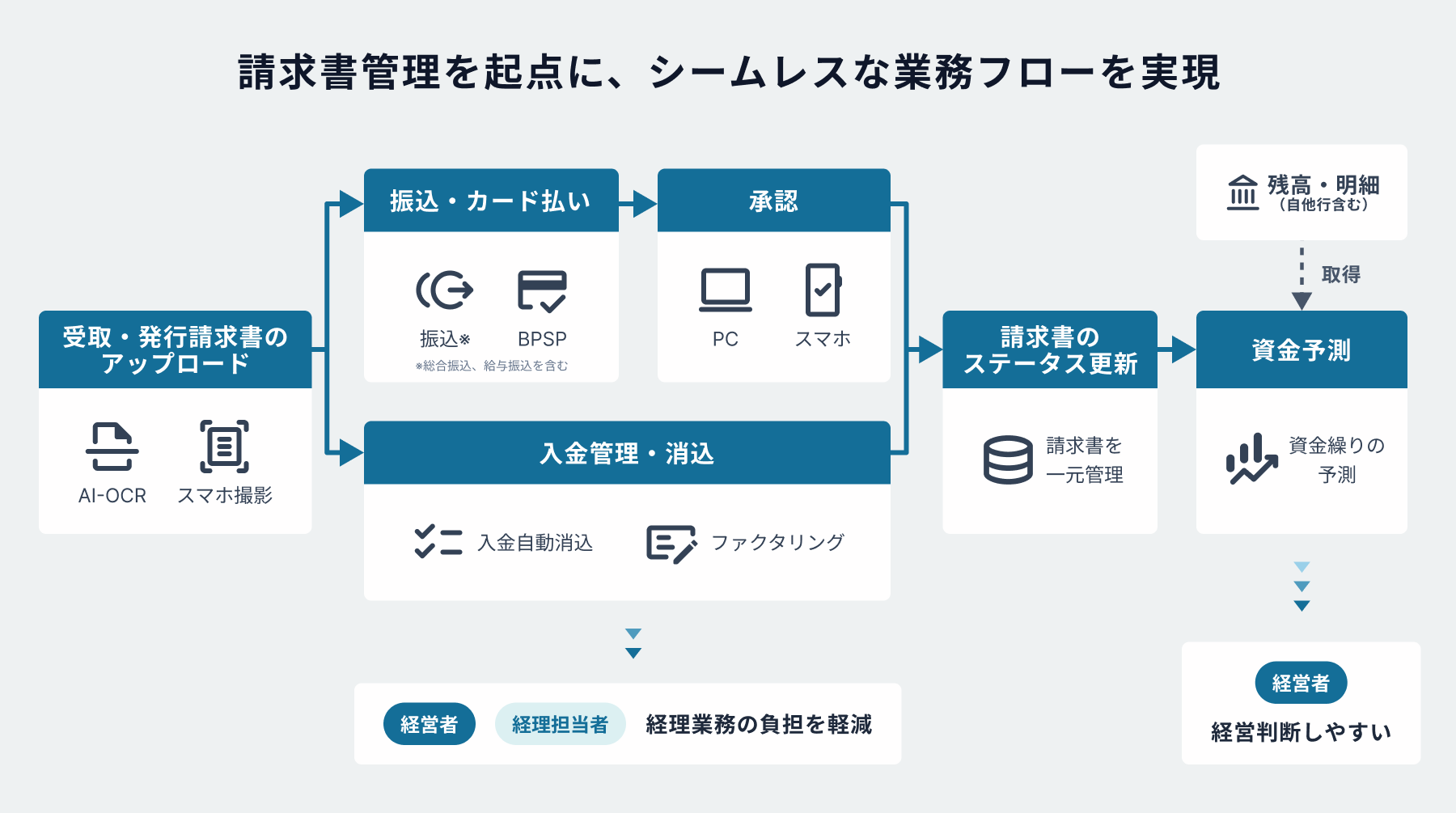 請求書の受領・発行から支払処理、入金消込までの一連の事務プロセスを、本サービス上で完結できます。AI-OCRによる請求書のデータ化や振込データの自動作成、インターネットバンキングと連携した振込・承認など、バックオフィス業務の効率化を実現。本サービスが「経理業務と決済をシームレスにつなぐハブ」となることで、企業は複数のツールを使い分ける手間がなくなり、事務負担の大幅な軽減が可能になります。