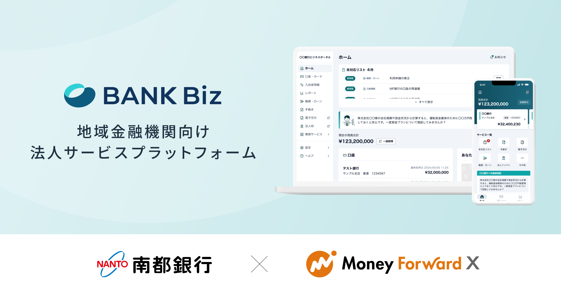マネーフォワードエックス株式会社は、株式会社南都銀行(以下、南都銀行)と、新たな法人向けデジタルサービス(以下、本サービス)の共同開発に合意したことをお知らせします。本サービスは、マネーフォワードエックスが提供する法人サービスプラットフォーム『BANK Biz』をベースに、南都銀行の法人インターネットバンキング基盤と統合・再設計します。法人顧客が日常の経理・決済・金融取引をシームレスに利用できる「次世代型サービス」として、2027年秋の提供開始を目指してまいります。
