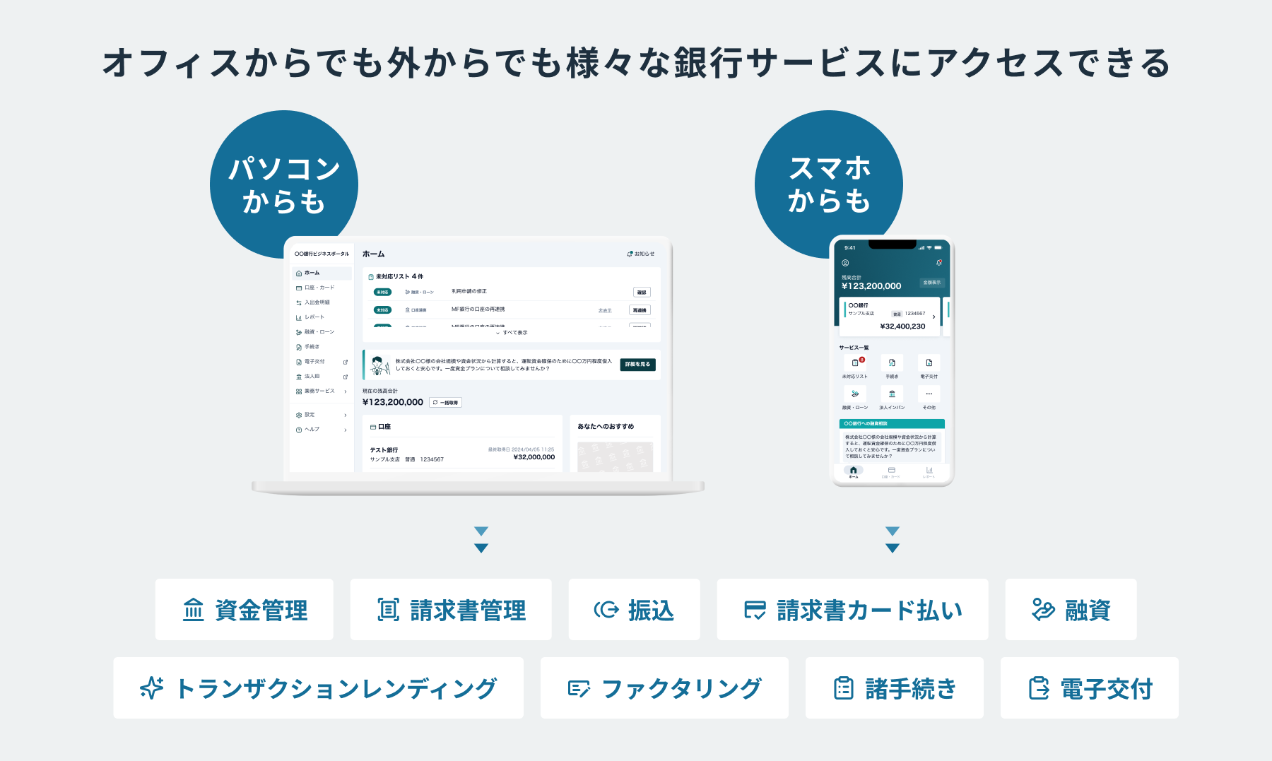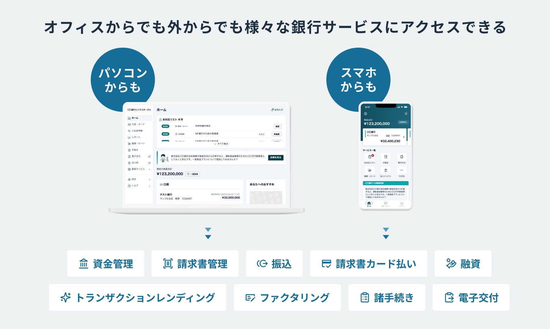 『BANK Biz』シリーズでは、オフィスでの利用に適したPC版ポータルに加え、経営者・経理担当者が場所を選ばず利用できるモバイルアプリ『BANK Biz App』を提供します。残高確認や資金繰りの可視化、振込・承認など、従来PCでしか行えなかった業務がスマートフォン上で完結します。また、入出金データを活用した資金繰りシミュレーションや、借入申込、ファクタリング、請求書カード払いなど、多様な資金調達手段をあらゆるデバイスから迅速に利用でき、経営判断のスピード向上を実現します。