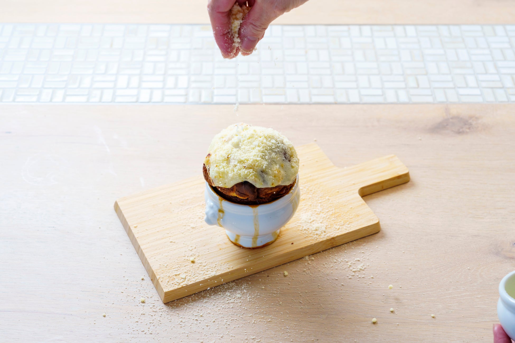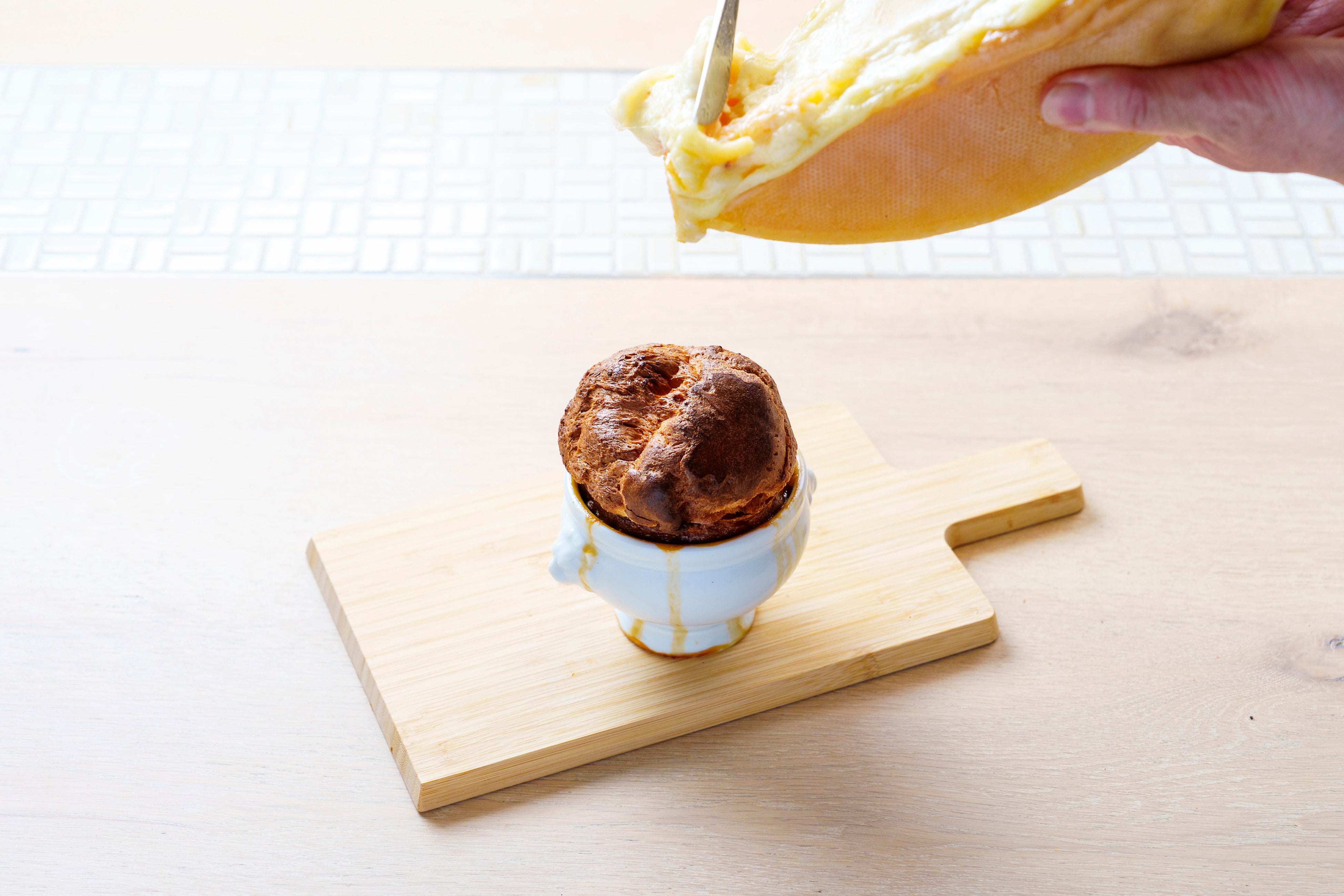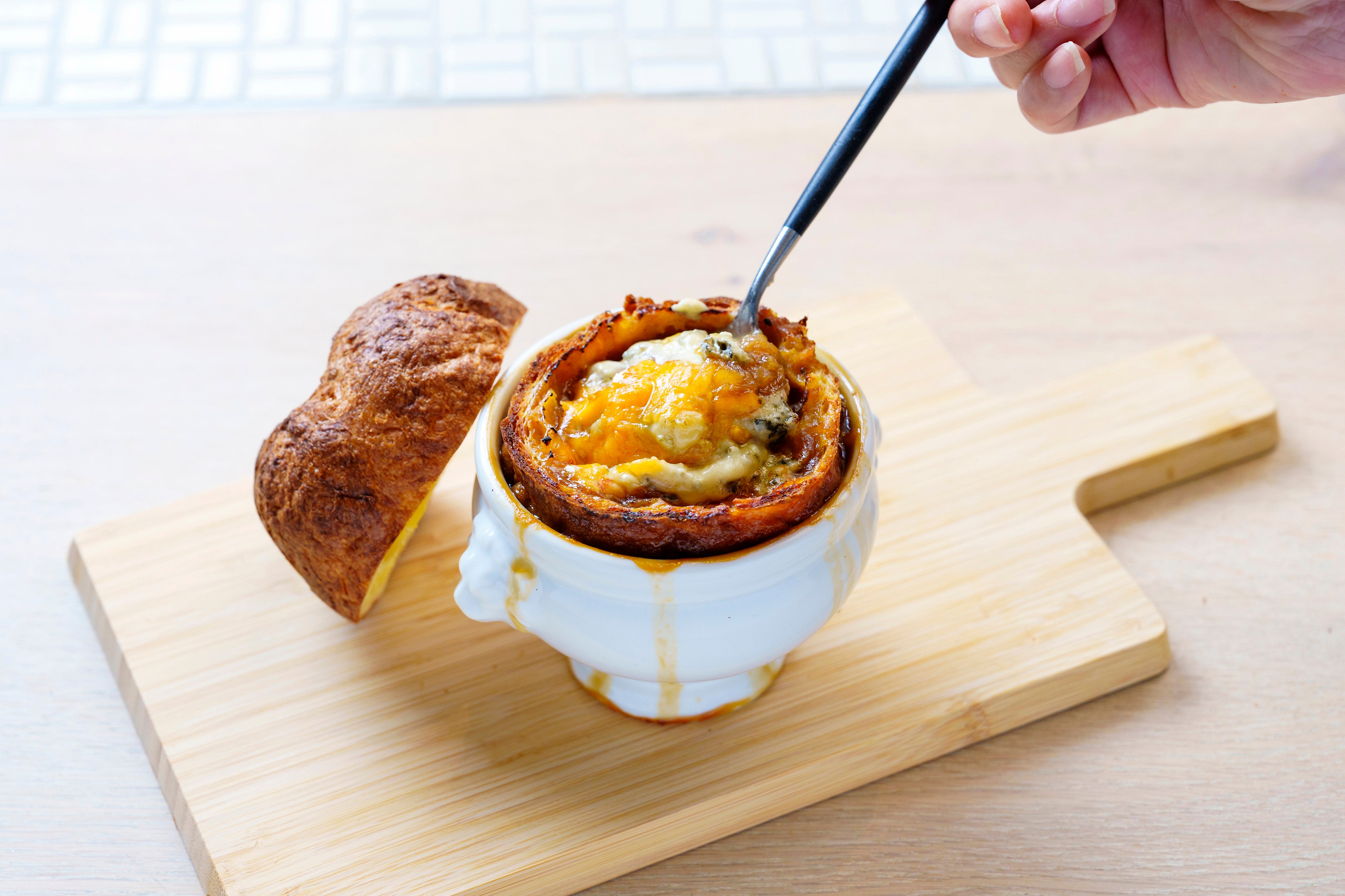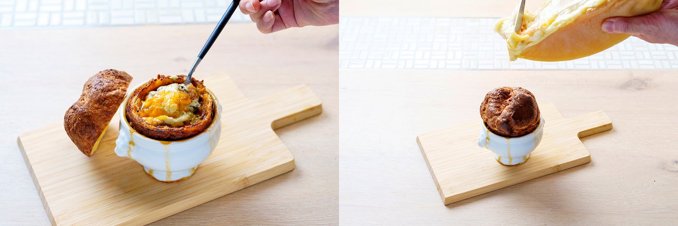 「スープ×ポップオーバー×クアトロ・フォルマッジ」は、焼き上げたポップオーバーの中に玉ねぎをしっかりと炒めたオニオンスープを閉じ込め、チェダーチーズとブルーチーズをミックスし、トッピング。仕上げにお客様の目の前で熱々のラクレットチーズをダイナミックにかけ流し、更にパルメザンチーズを振りかけます。とろける4種のチーズとポップオーバーを崩しながら中のオニオンスープと合わせ、濃厚な味わいをお楽しみください。