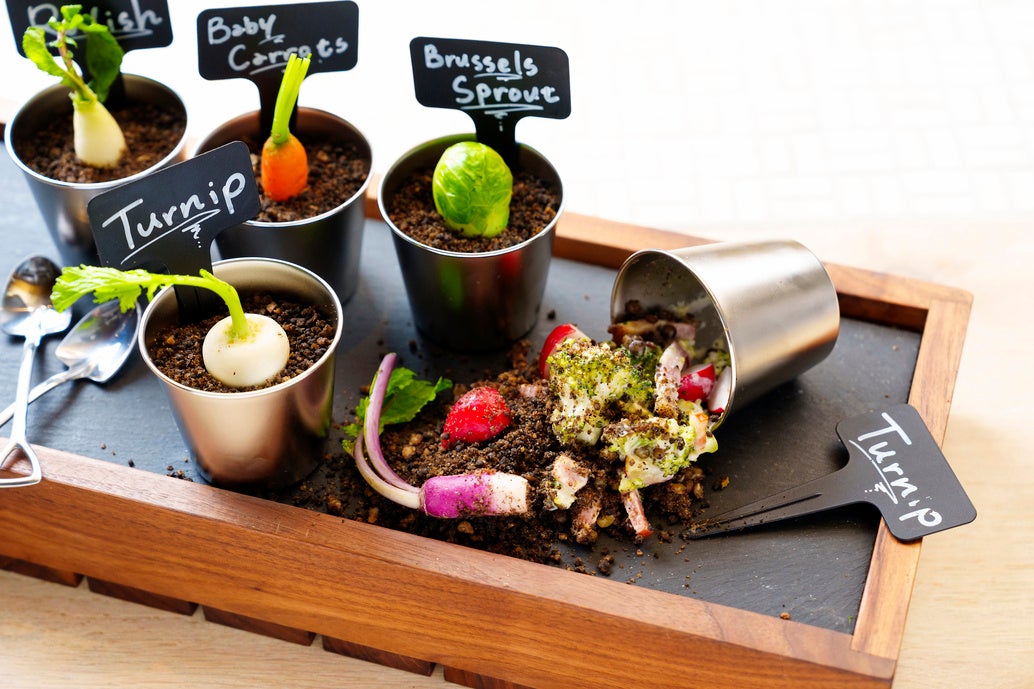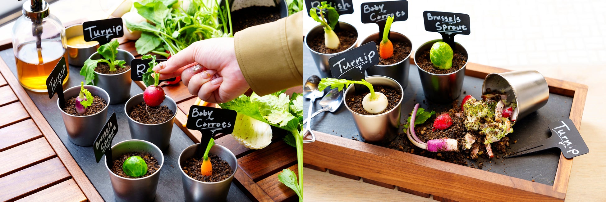 「こだわり野菜の収穫祭」は、プランターに見立てた器に国産野菜を入れた、見た目も味も食べ方も楽しめるサラダ。器の中にはサラダが三層になっています。一番下にはブロッコリーとベーコンのサラダ、二層目にフレンチ風のレンズ豆のサラダ、一番上には土に見立てた黒オリーブのピューレとカリカリに乾燥させたバケットをミックスしたものをのせました。食べる際は、じょうろに入った野菜の出し汁を土にかけて、下味をつけます。その後、プランターに植えられた新鮮な野菜を手で収穫し、シェフ特製のカレー風味のシーザーサラダドレッシングにディップしてお召し上がりください。最後は全体をミックスしながら、出し汁やドレッシングを追加頂くことで、味の変化をお楽しみいただけます。