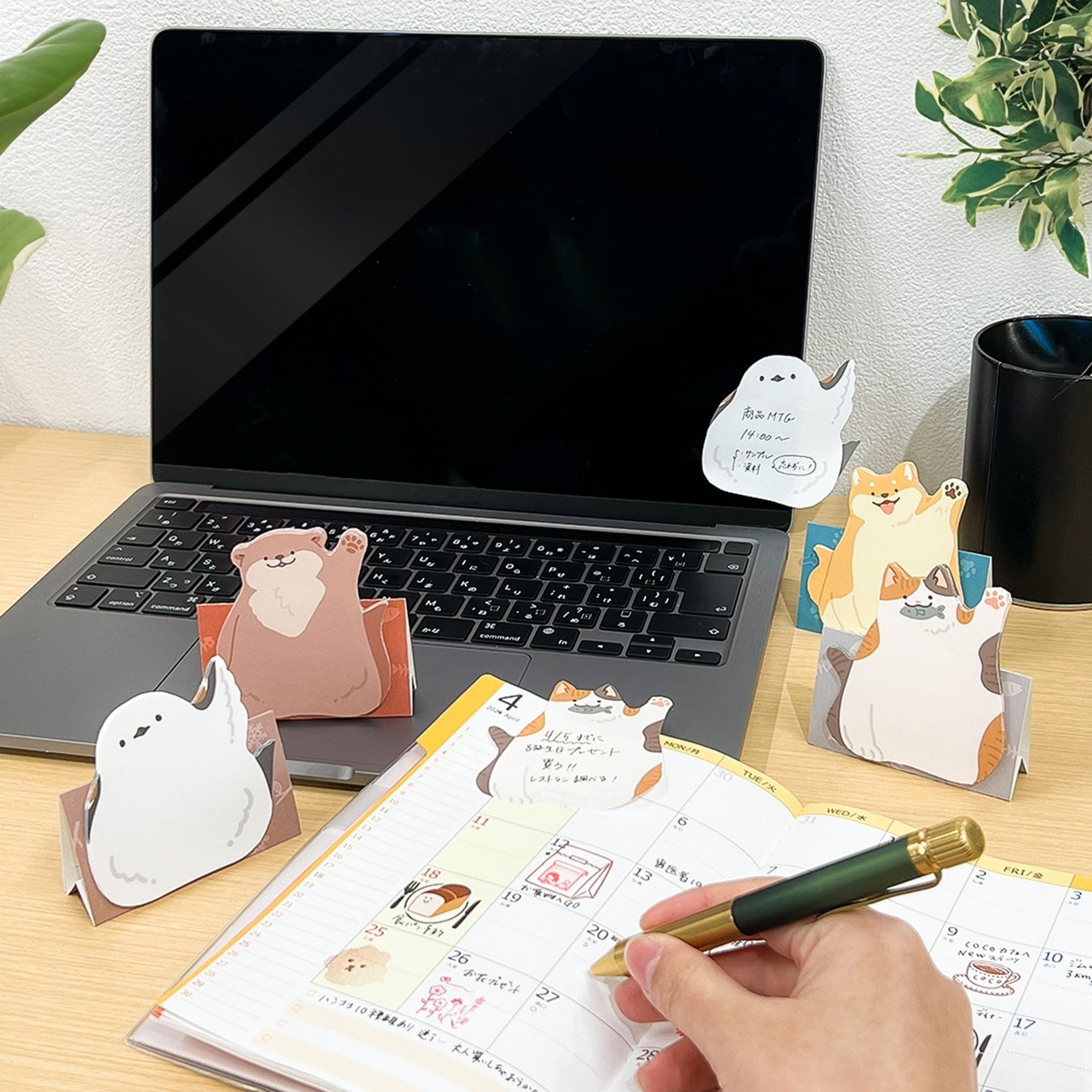 ふっくらとしたシルエットの動物が片手をあげている形の付箋。伝言や目印などさまざまなシーンで使いやすく、スタンド台紙付きなのでデスクに立てても。