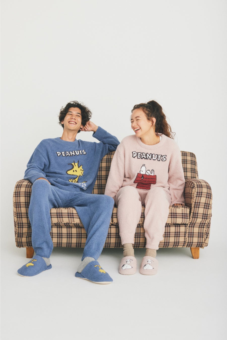 ソファーでくつろぐチャーリー・ブラウンとスヌーピー、ウッドストックのデザインはメンズとお揃いで着用できるデザイン。