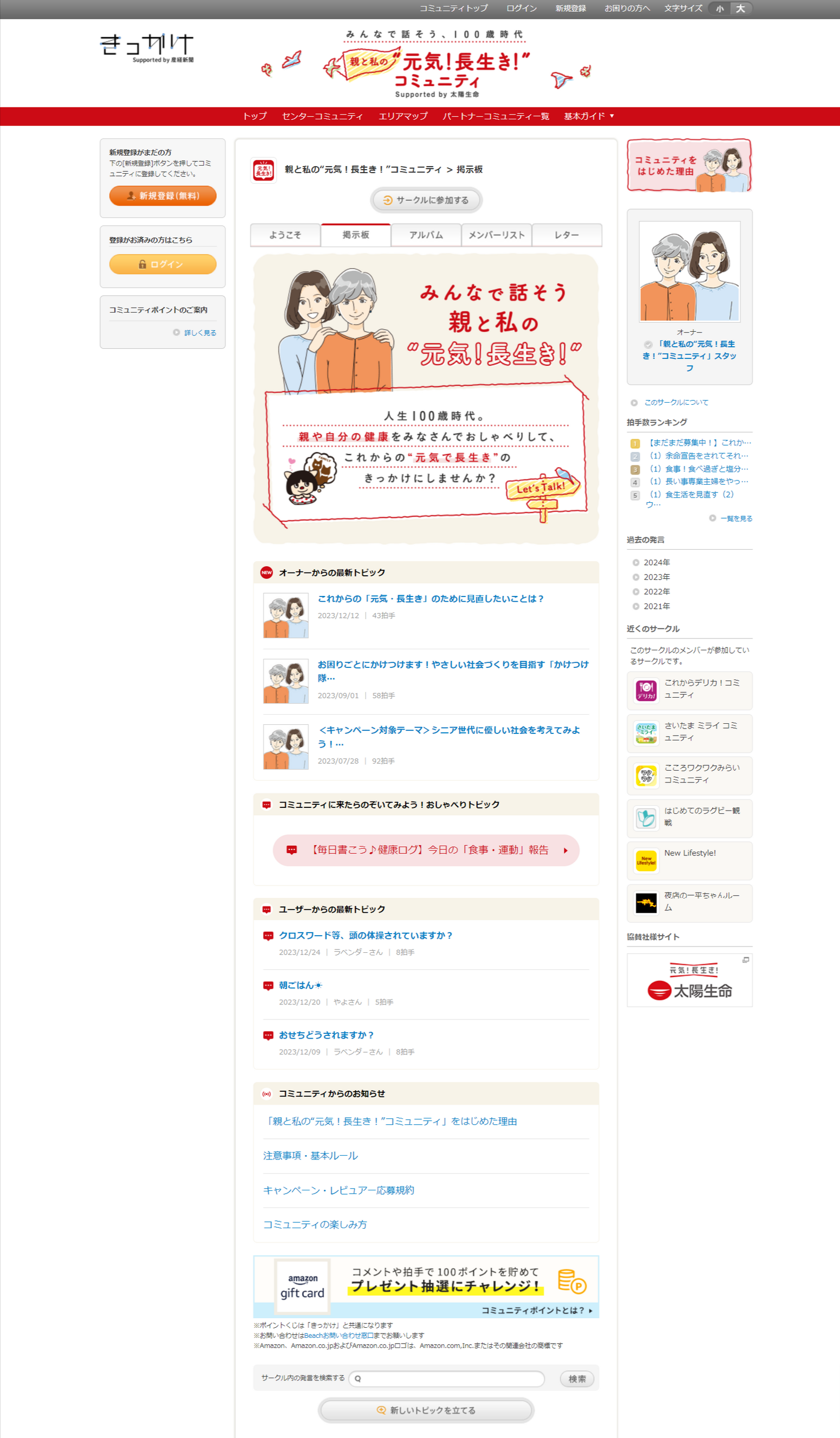 本コミュニティは、健康をテーマにさまざまな世代が語り合う場であると同時に、協賛社である太陽生命保険が「認知症保険」など社会的ニーズの高い商品・サービスを通じ日本の「元気!長生き!」を支えていることや、それにまつわるさまざまな取り組みへの理解促進を目的に運営しております。