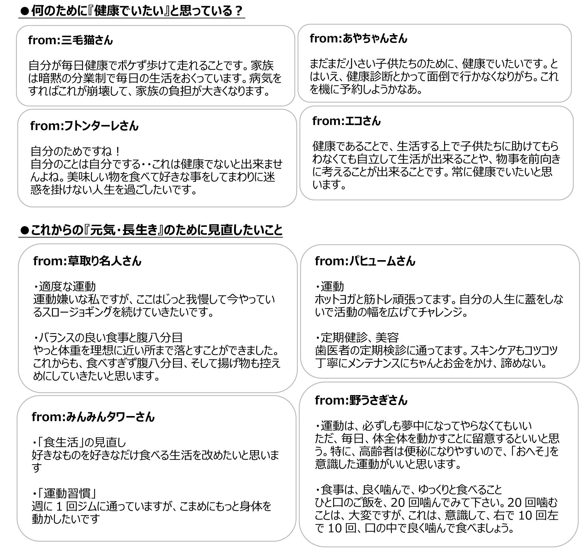 今回、コミュニティスタッフが投げかけたトークテーマの中から、前述の、太陽生命の保険契約者であるユーザーの傾向をご紹介した「何のために『健康でいたい』と思っている?」(※2)と、最新のトークテーマ「これからの『元気・長生き』のために見直したいことは?」(※3)について、コミュニティ参加者から特に共感を集めていたコメントをご紹介いたします。