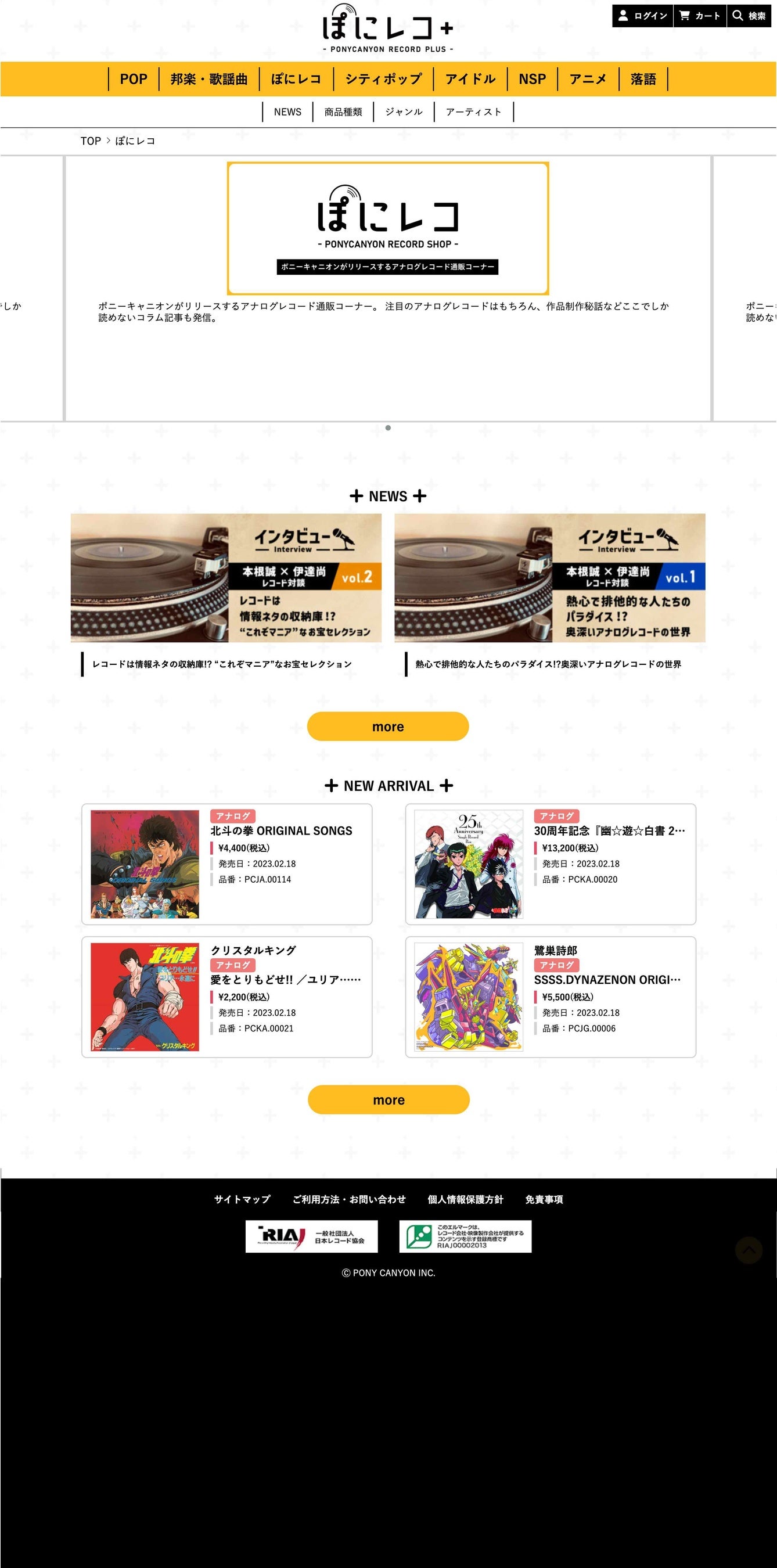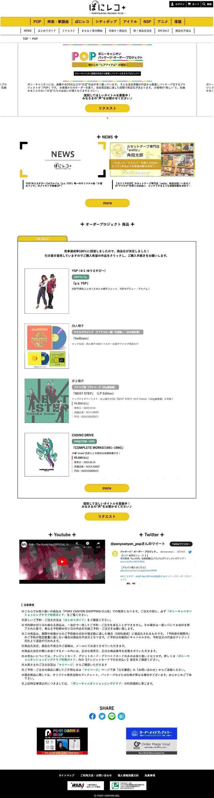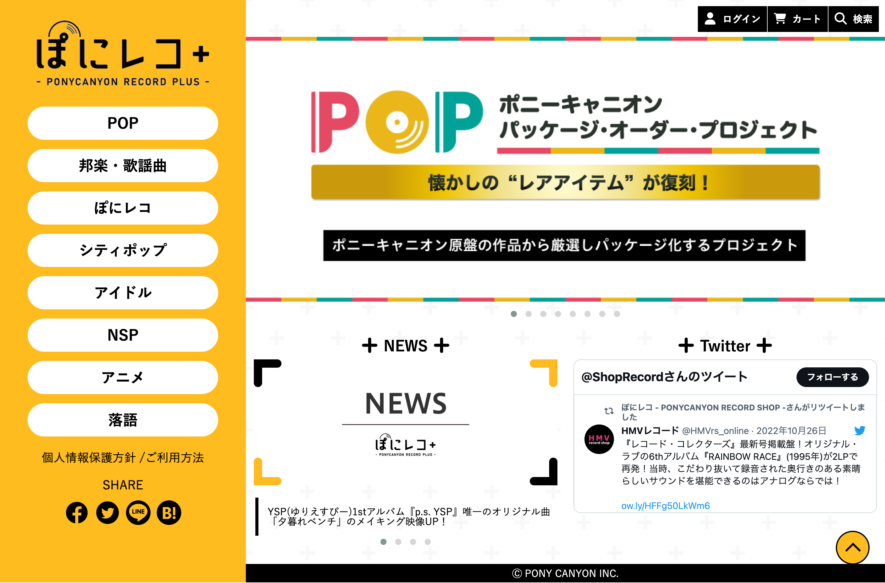 本サイトは、アナログレコードの専門サイト「ぽにレコ」、ファンのオーダー数が規定に達すると商品化される「POP(パッケージ・オーダー・プロジェクト)」、”お宝”な通信販売専用商品を扱う「お宝マーケット」などの既存のアーカイブECサイトを統合したもの。これに加え、シティポップやアイドル、アニメやジャズなどのロングセラータイトルもラインアップし、ジャンルを横断したニーズに応えるサイトへとパワーアップした。
