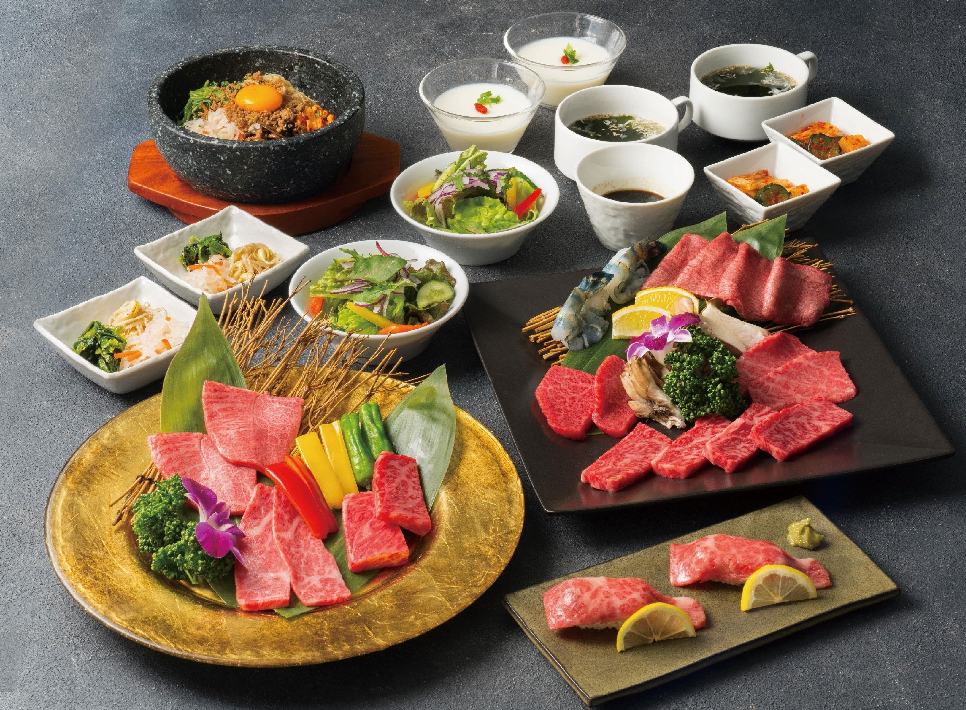 【前菜】キムチ/ナムル/サラダ、【焼物】特上牛タン塩/特撰山形牛一頭六種/海老焼き