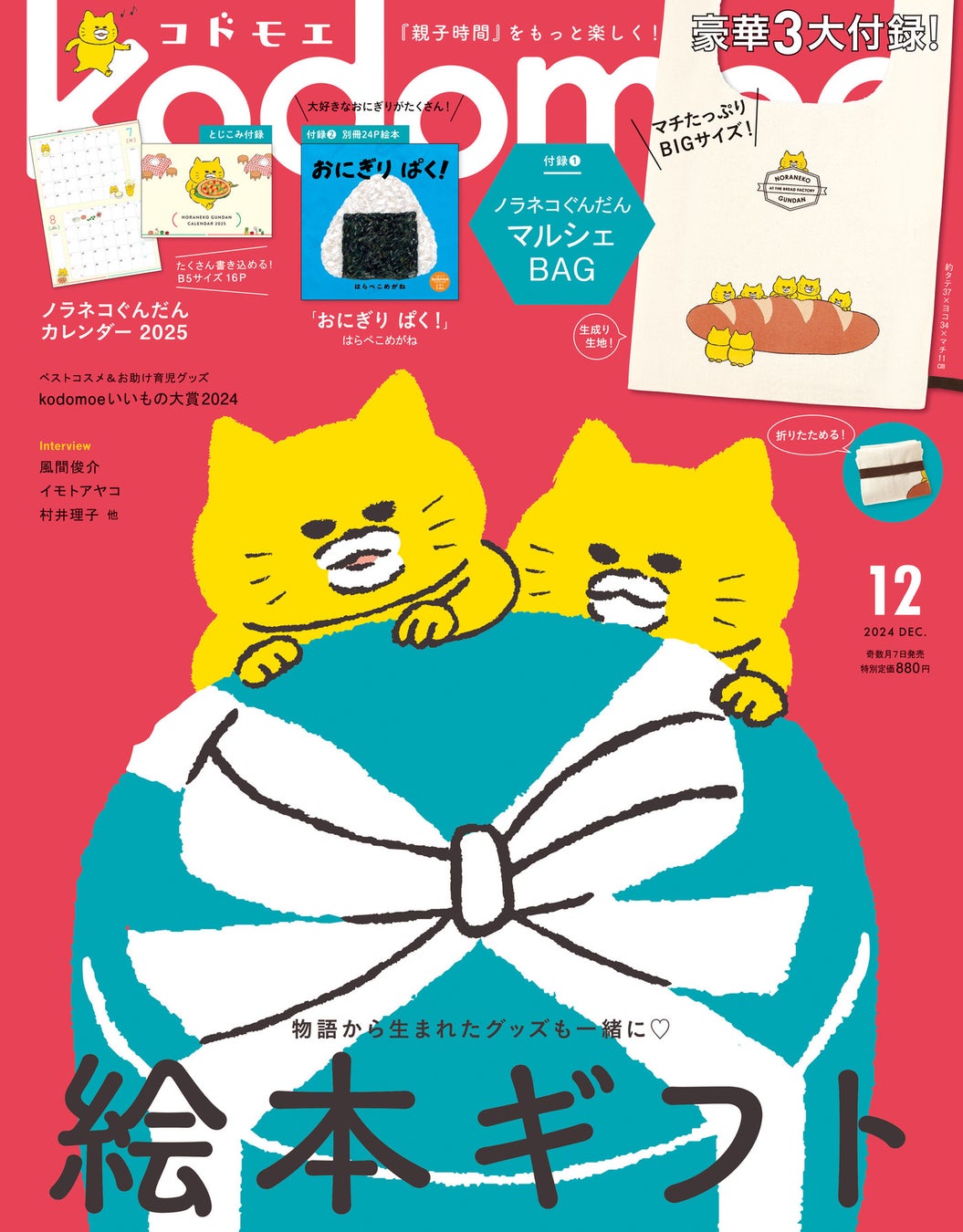 3大付録は①ノラネコぐんだん マルシェBAG/②別冊24P絵本/③とじこみ付録 ノラネコぐんだん カレンダー2025『kodomoe12月号』11月1日発売!