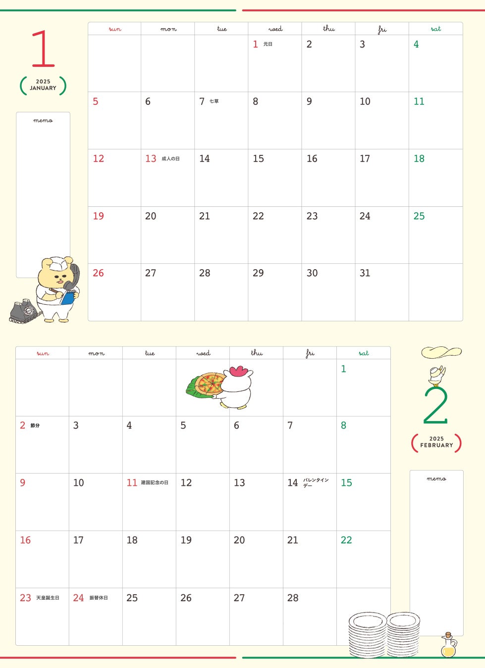 毎年好評、スケジュールがたっぷり書き込めるB5サイズ16Pの壁掛けカレンダー。今回は、最新作『ノラネコぐんだん ピザをやく』のピザづくりシーンなど楽しいイラストがいっぱい。おいしそうなピザを見るたびにほっこりした気分になれそうです。2025年もノラネコぐんだんと一緒に元気に過ごしましょう。