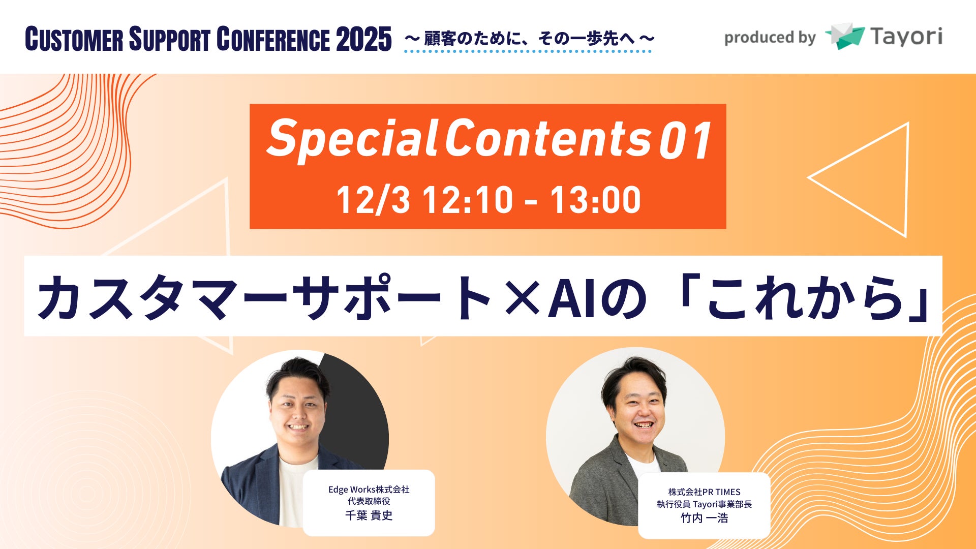 株式会社PR TIMES(東京都港区、代表取締役:山口拓己、東証プライム:3922、以下:PR TIMES)が運営するカスタマーサポートツール「Tayori」(読み:タヨリ)は、2025年12月3日(水)に、"顧客のために、その一歩先へ"をコンセプトに、世の中のカスタマーサポートをみんなで一歩前に進めるカンファレンス「Customer Support Conference 2025(カスタマーサポートカンファレンス2025)」を開催します。カスタマーサポートカンファレンス2025は、カスタマーサポートに従事するすべての方々へ明日から使えるノウハウや最新トレンドを、カスタマーサポートサービスを提供するプロフェッショナルや現場で活躍する担当者たちとお届けするオンラインカンファレンスです。