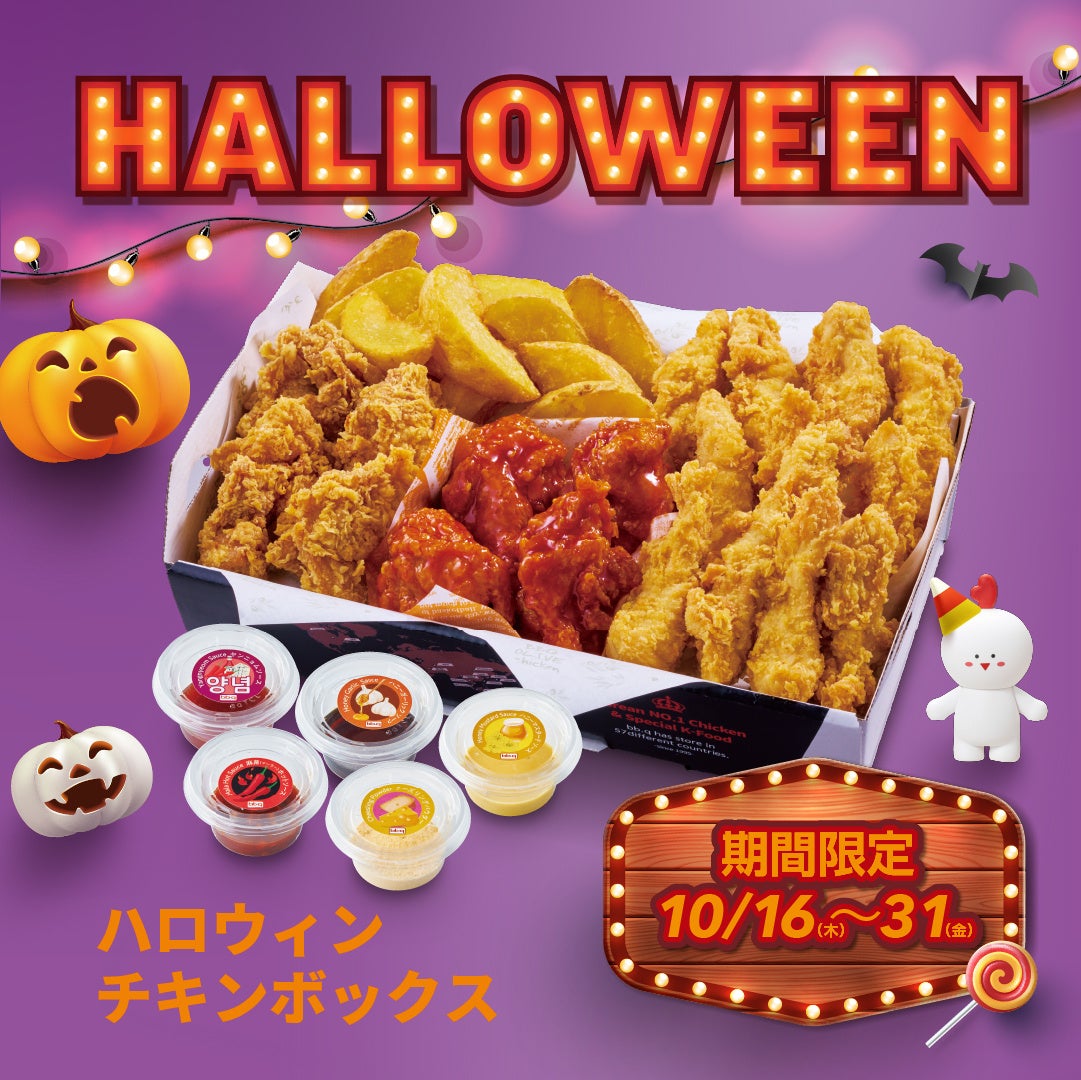 人気の骨なし黄金フライドチキンやヤンニョムチキンをはじめ、チキンフィンガーやフライドポテト、全5種類のディップソースまで詰め合わせた、家族や仲間とハロウィンを楽しむのにぴったりな特別ボックスです。