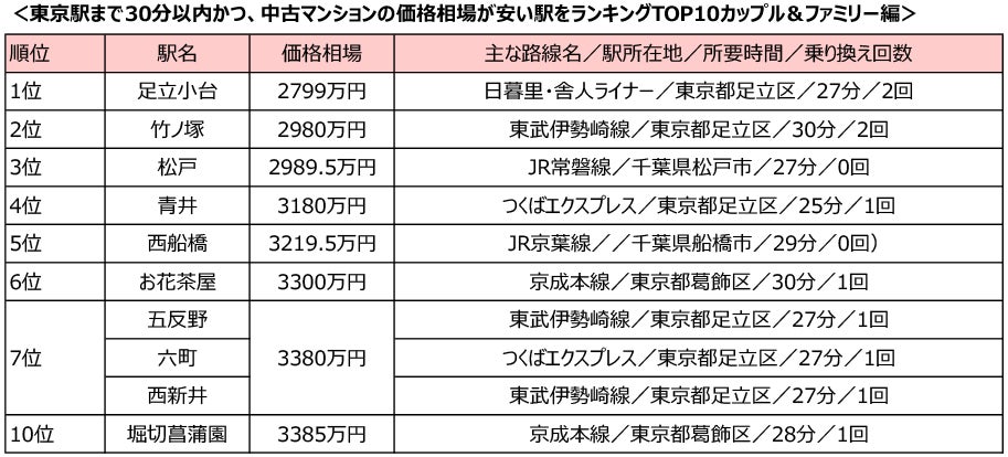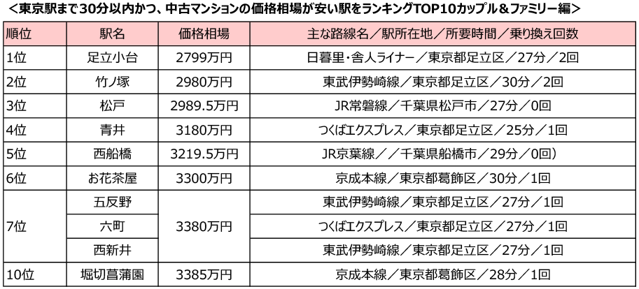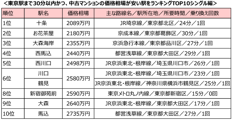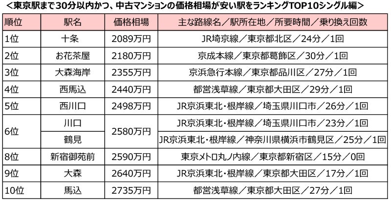 「東京駅」まで30分以内、中古マンション価格相場が安い駅ランキング「シングル向け」1位は再開発が進む「十条駅」!「カップル・ファミリー向け」の注目の駅は3位にランクインした「松戸駅」