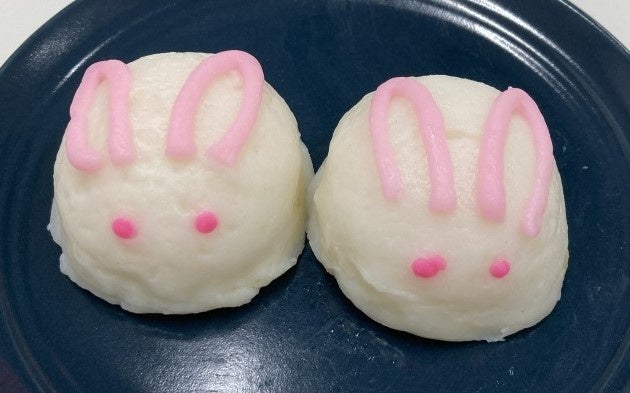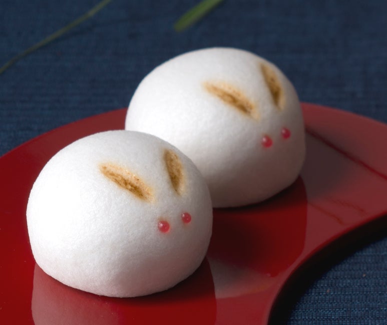 お月見にちなみ、満月のようにふっくらと丸い薯蕷饅頭に焼印を入れ、白うさぎの姿を表現しました。