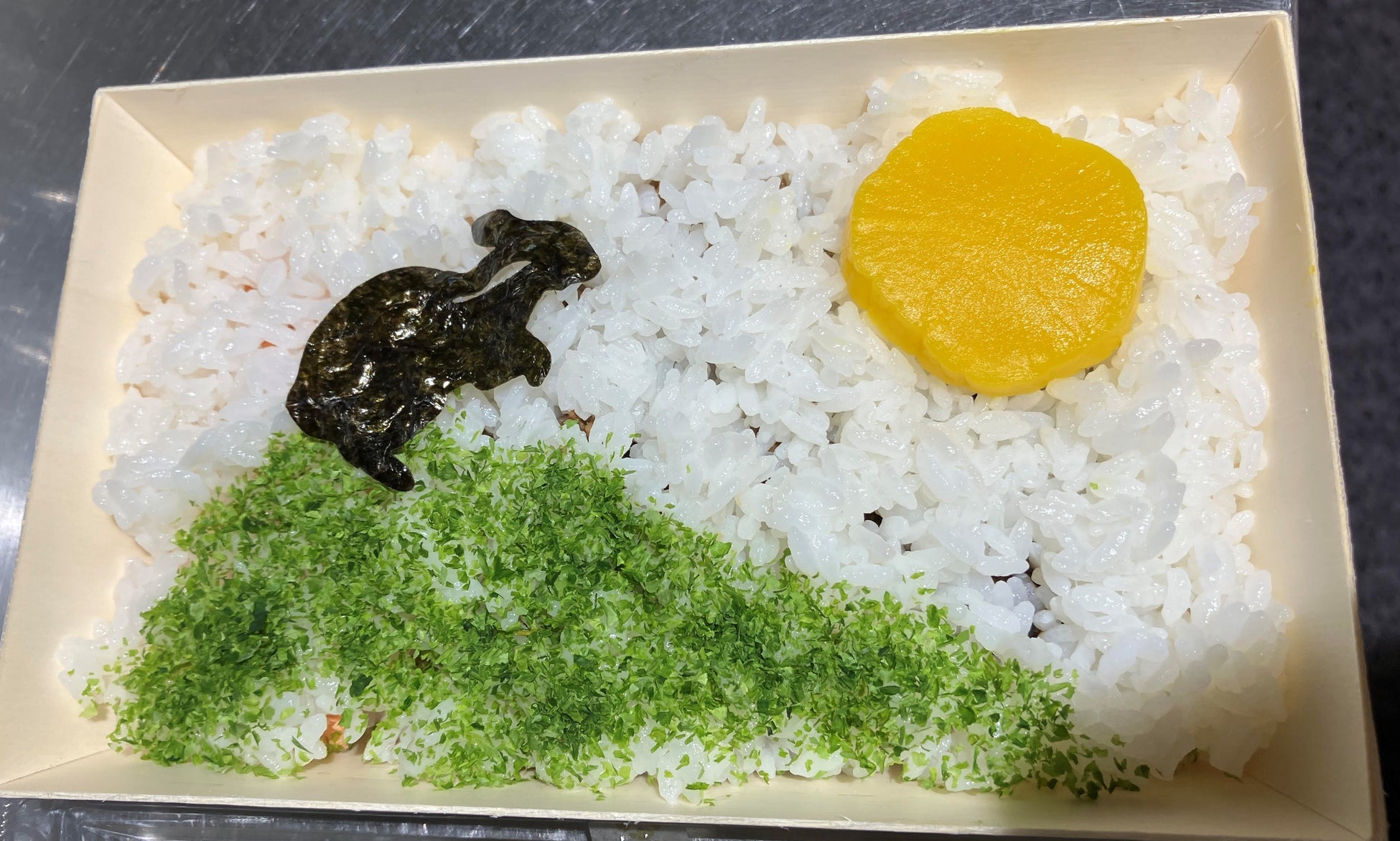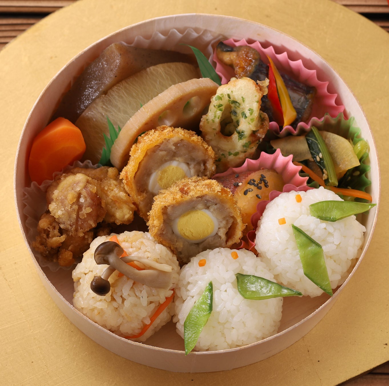 うさぎおにぎりがかわいらしい限定のお弁当です。うずらをお月さまにみたて、里芋でくるんだ丸いコロッケも入っています。その他唐揚げや大学芋、茄子の生姜和え、生芋こんにゃくなど、盛り沢山のお弁当です。