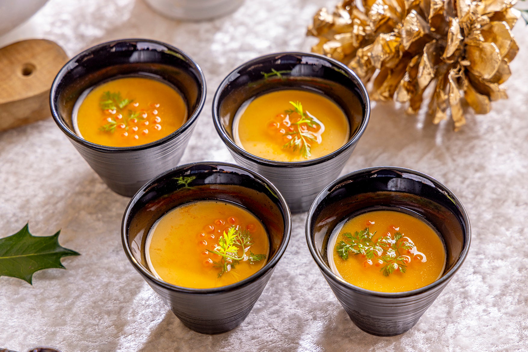 フランスの料理法でオマール海老の濃厚な風味を引き出した「オマールフラン」やシンガポールやマレーシア名物の麺「ラクサ」を使ったサラダ、フランスの郷土料理「タルトフランベ」をはじめ、濃厚な旨味とオレンジのフルーティーな風味が絶妙な「鴨のロースト オレンジソース」(ディナータイムのみ)、フレンチの前菜の定番で優しい甘みとフォアグラの深い旨味が調和した「林檎のキャラメリゼ フォアグラのテリーヌ」(12/21~25のみ)などをご用意しています。