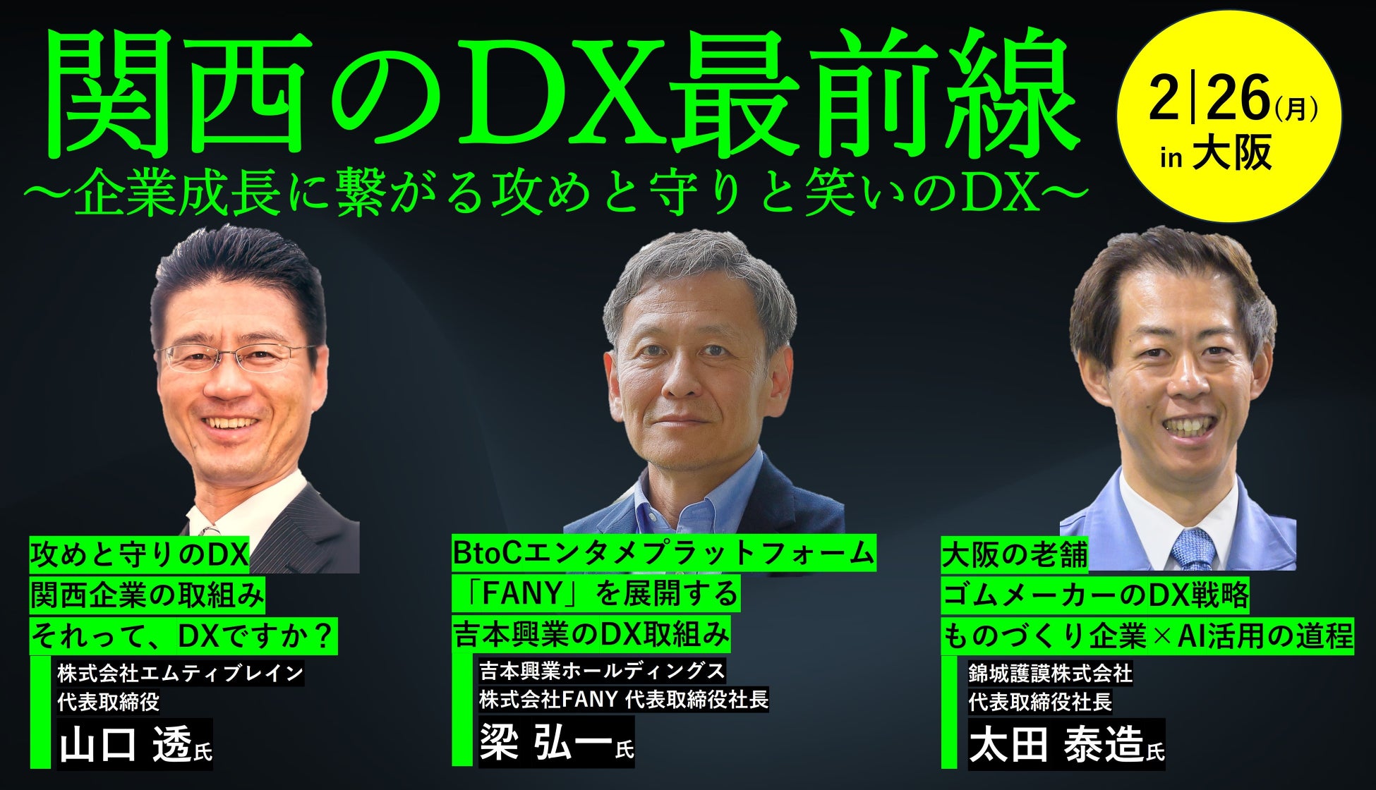 基調講演ではエムティブレイン代表の山口透氏が、攻めのDX、守りのDXについて関西企業の取り組みなどを紹介。吉本興業ホールディングス傘下FANY社長の梁弘一(ヤンホンイル)氏は、お笑いを中心とした吉本のコンテンツをDXでいかに届け、ファンを増やしてきたかについて説明します。特別対談では「KANSAI DX AWARD 2023」で近畿経済産業局長賞に輝いた錦城護謨社長の太田泰造氏が、自社の課題に向き合いスタートアップ企業と連携しながらDX化を推進した経験や、中堅中小企業におけるAI活用について山口氏と語り合います。