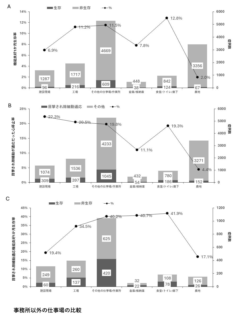 結果:農地でのOHCA症例は事務所以外の仕事場で発生したOHCA症例と比較して、傷病者が高齢であること、心肺停止の目撃が少ないこと、除細動の適応症例が少ないこと、AEDの使用が少ないこと、心肺蘇生法の実施率が低いことなど、生存に不利な特徴があること、救急隊が通報を受けてから傷病者に接触する時間も大幅に遅延していたこと、農地におけるOHCA症例の神経学的に良好な1か月生存率が極端に低かったことなどが分かりました。