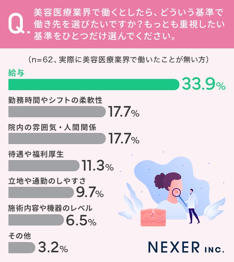続いて、美容医療業界で働くとしたら、どういう基準で働き先を選びたいかを聞いてみました。