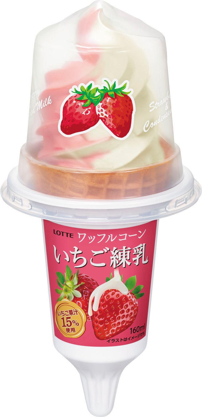 【内容】いちごアイスと練乳アイスの2色巻きのワッフルコーンアイスです。いちご果汁を30%配合(製品中15%)して甘酸っぱさを表現したいちごアイスに、ミルクの風味が味わえる練乳アイスを相性抜群に仕立てました。サクサクのコーンは小麦粉の一部に全粒粉を使用し、香ばしい風味を楽しめます。