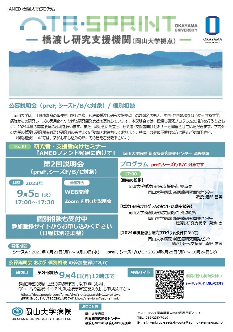 【岡山大学】2024年度橋渡し研究プログラム(岡山大学拠点)第2回オンライン公募説明会(preF、シーズF/B/C対象)〔9/5,火 オンライン開催〕