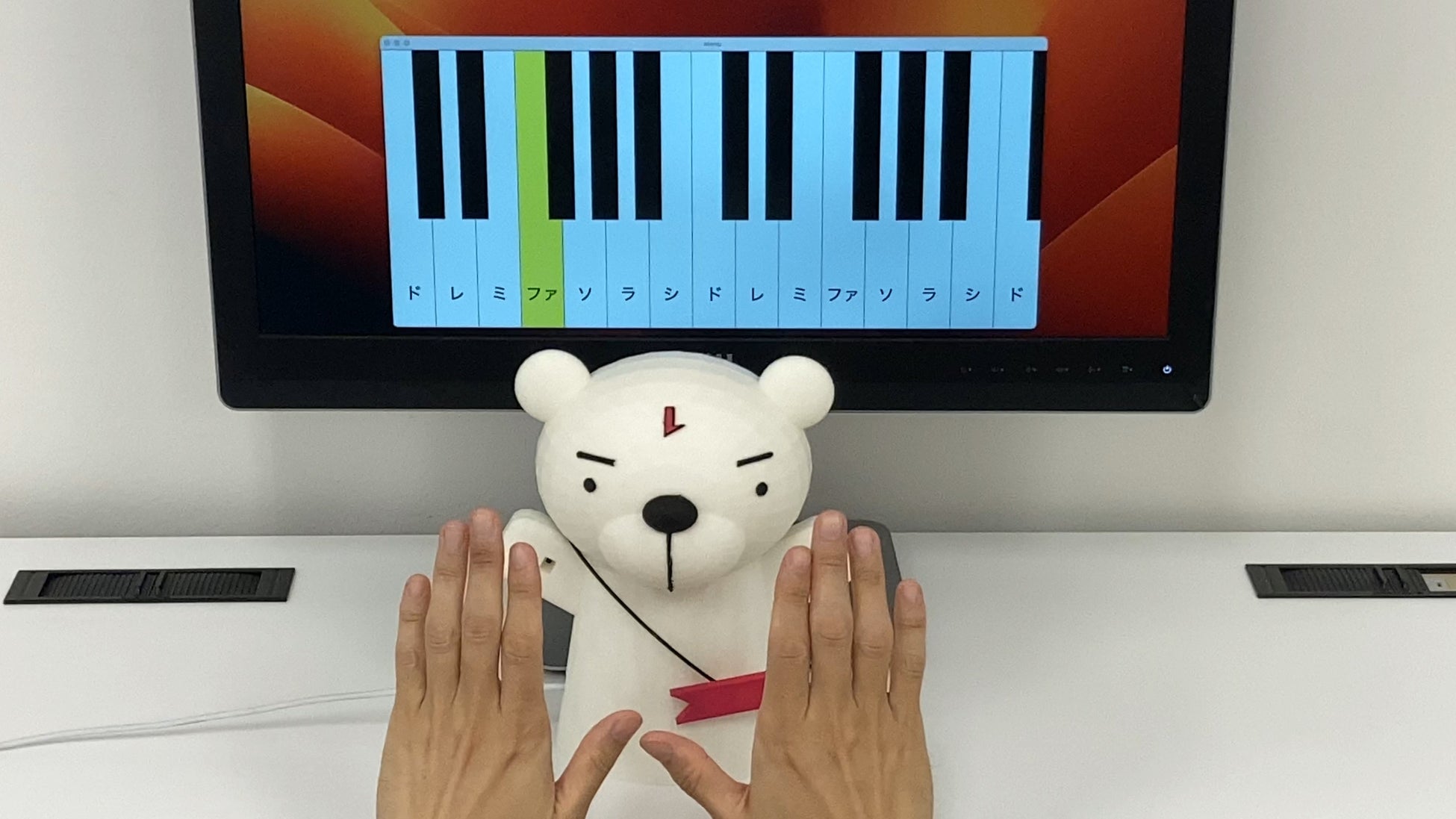 ・3Dプリンタで立体造形された「レコチョクマ」に手をかざすと音色を奏でます。また、PCに鍵盤UIを表示し、音階をわかりやすく表現する機能を付けました。